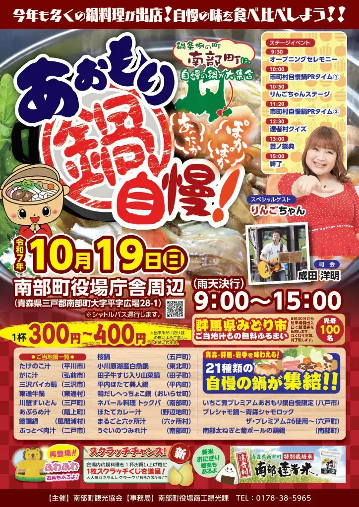 青森県三戸郡南部町の南部町役場庁舎周辺を会場に、「あおもり鍋自慢2025|青森・岩手・群馬の21種類ご当地鍋大集合!りんごちゃんステージも」が2025年10月19日(日)9時から15時まで開催されます(雨天決行)。