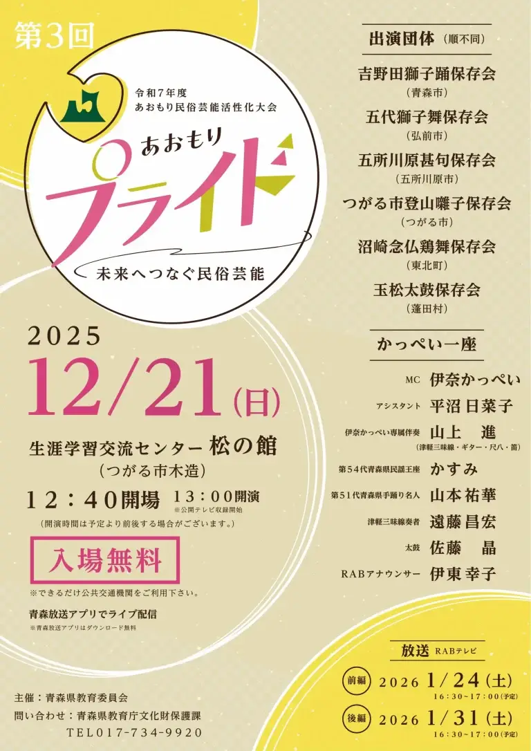 青森県つがる市の生涯学習交流センター 松の館ホールで、「第3回 あおもりプライド~未来へつなぐ民俗芸能~」(令和7年度 あおもり民俗芸能活性化大会)が2025年12月21日(日)に開催されます。開場は12:40、公演は13:00~16:30まで行われ、県内各地の獅子踊や太鼓、民謡団体が一堂に会して、次世代へ受け継ぎたい民俗芸能の魅力を披露します。MCには伊奈かっぺいさん、アシスタントに平沼日菜子さんが登場し、トークを交えながらステージを進行。入場無料で観覧できるほか、当日は青森放送アプリでのライブ配信も予定されており、会場に足を運べない方も自宅から公演を楽しむことができます。