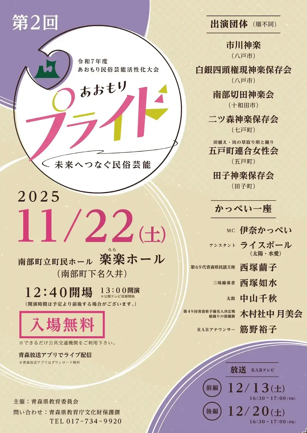 青森県教育委員会が主催する「第2回 あおもり民俗芸能活性化大会(あおもりプライド)」が、青森県南部町立町民ホール「楽楽ホール」で開催されます。