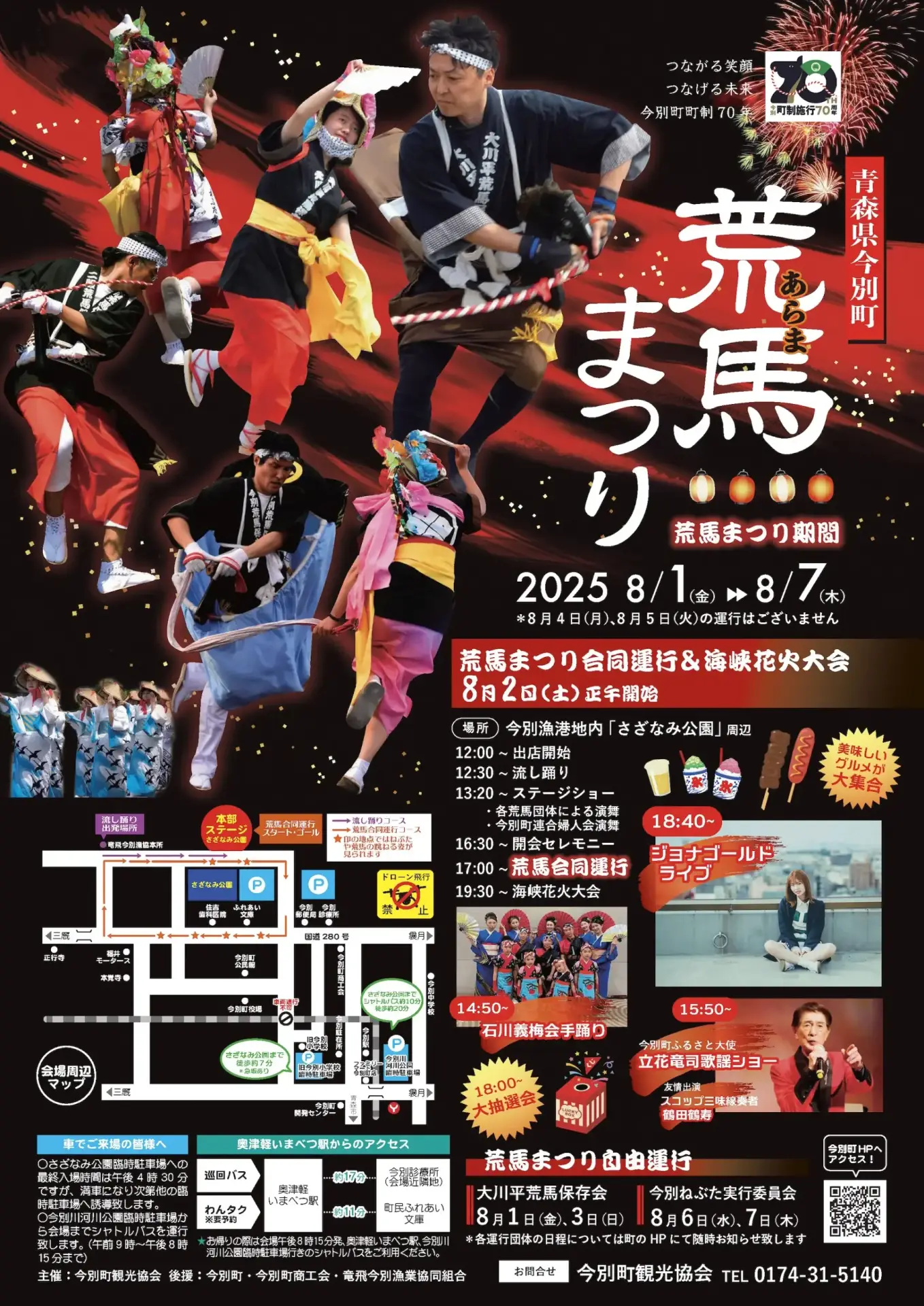 青森県今別町にて、「荒馬まつり2025」が2025年8月1日(金)から8月7日(木)まで開催されます(※8月4日・5日は運行なし)。70年以上の歴史を誇るこの祭りでは、町内各地を練り歩く勇壮な荒馬演舞や流し踊り「今別おけさ」、歌謡ショー、地元団体による舞踊が披露され、夜には海峡を背景に花火大会が打ち上げられます。中でも8月2日(土)には合同運行&海峡花火大会が開催され、今別町の夏が最高潮に盛り上がります。