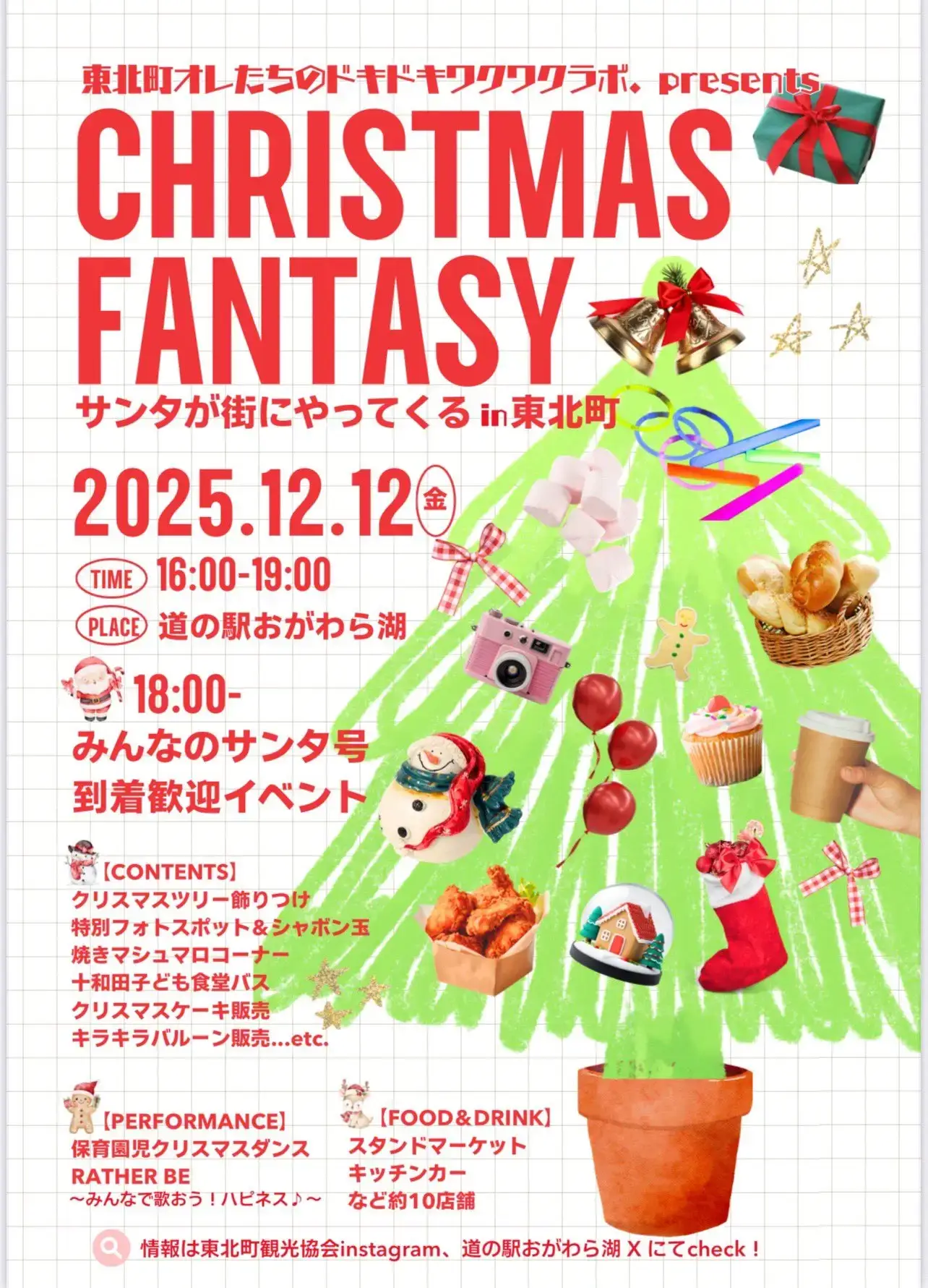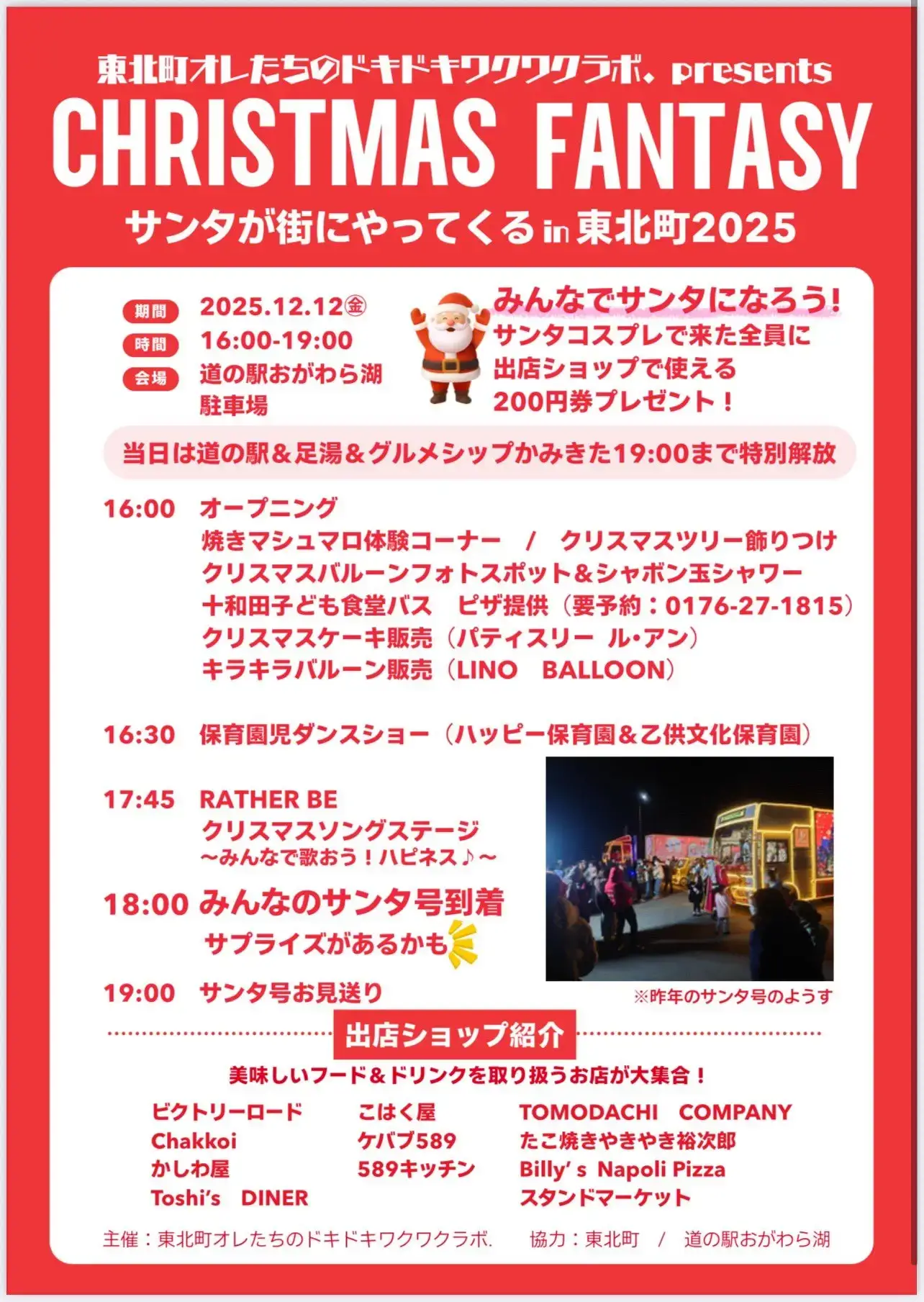 青森県東北町の道の駅おがわら湖駐車場で、「CHRISTMAS FANTASY サンタが街にやってくる in 東北町2025」が2025年12月12日(金)16:00〜19:00に開催されます。イベント当日は、クリスマスツリーの飾りつけや焼きマシュマロ体験コーナー、クリスマスバルーンフォトスポット&シャボン玉シャワー、十和田子ども食堂バスによる出店、クリスマスケーキ販売、キラキラバルーン販売などが行われ、17:45からはRATHER BEによるクリスマスソングステージ、18:00には「みんなのサンタ号」到着イベントが予定されています。サンタコスプレで来場した人には、出店ショップで使える200円券がプレゼントされる企画も実施されます。