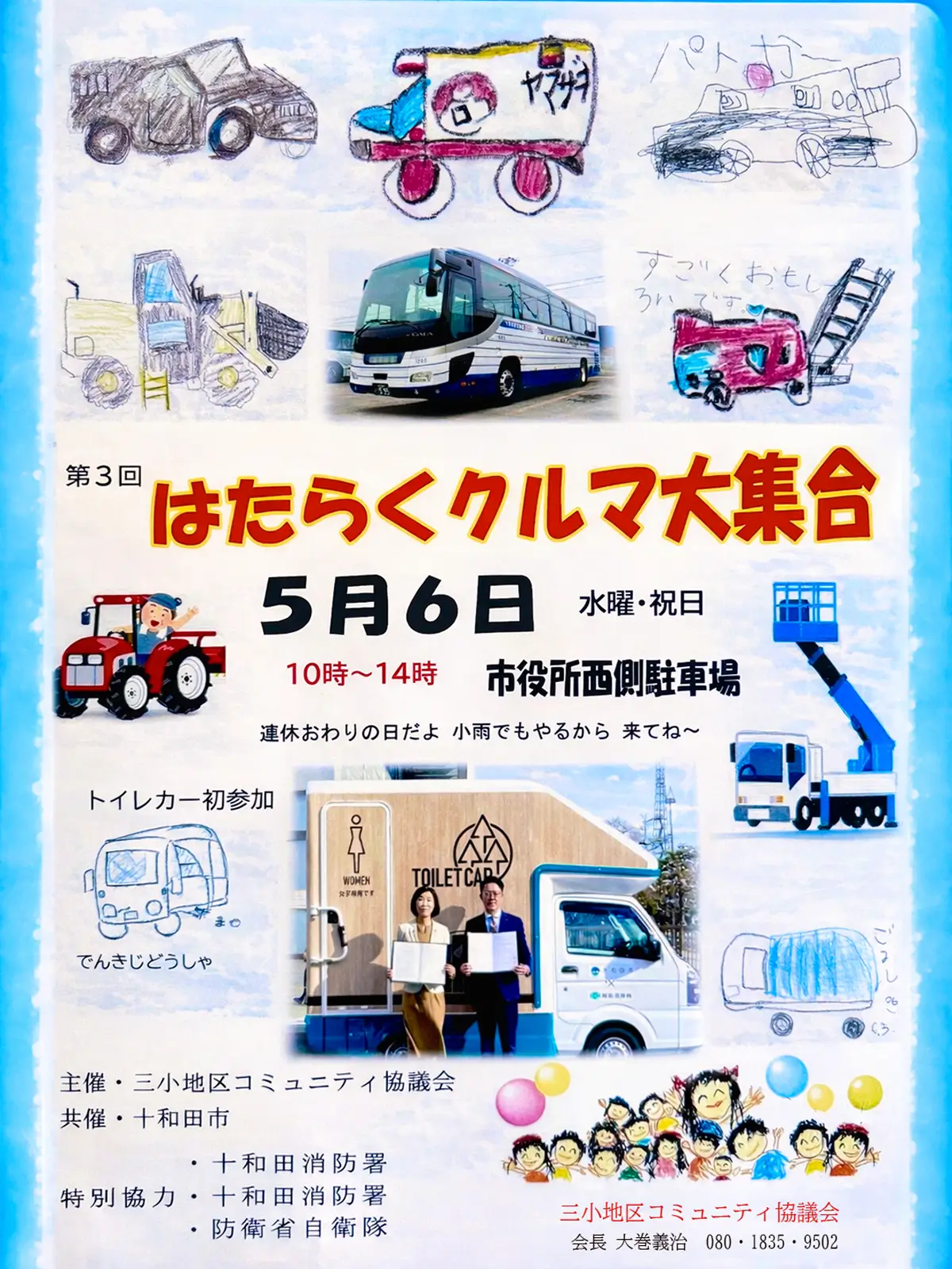第3回 はたらくクルマ大集合が、2026年5月6日(水・祝)に十和田市の市役所西側駐車場で開催されます。時間は10:00〜14:00です。パトカーや消防車、重機など、さまざまなはたらくクルマを間近で見られる、家族で楽しめる注目イベントです。