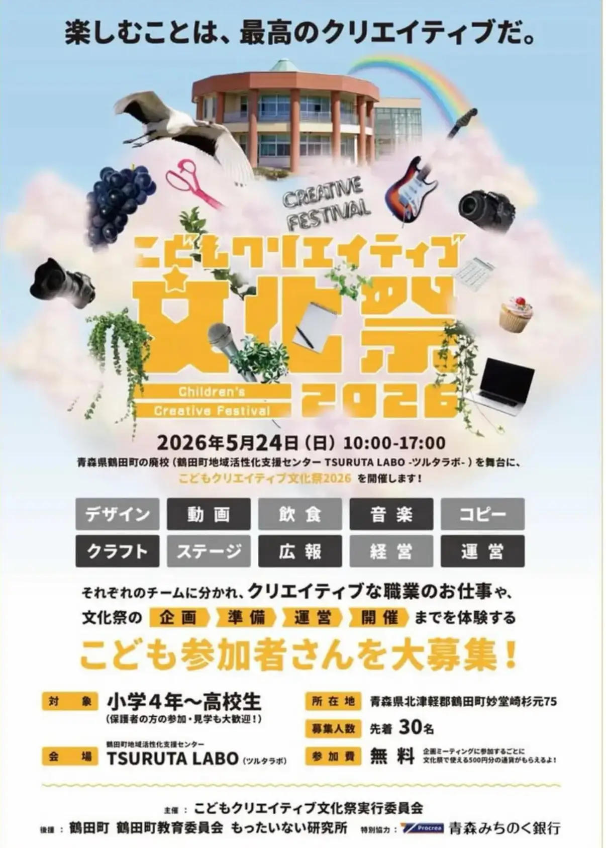 青森県北津軽郡鶴田町の「鶴田町地域活性化支援センター TSURUTA LABO(ツルタラボ)」にて、2026年5月24日(日)の10:00から17:00まで「こどもクリエイティブ文化祭2026」が開催されます。