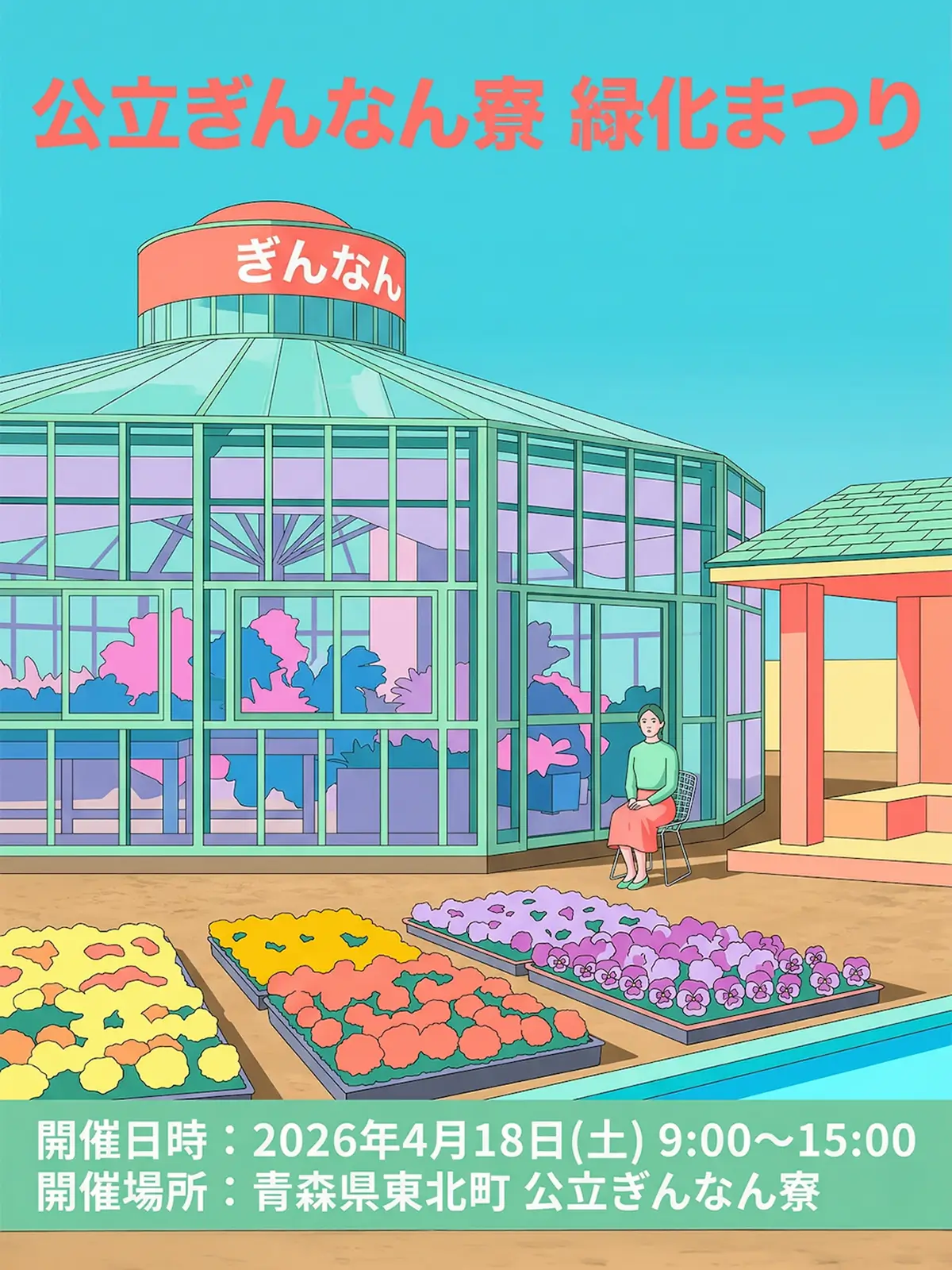 青森県上北郡東北町で、2026年4月18日(土)に「公立ぎんなん寮 緑化まつり」が開催されます。会場は公立ぎんなん寮で、開催時間は9:00から15:00までです。春の訪れを感じられる草花の販売をはじめ、福祉施設商品も並ぶ催しとして、毎年楽しみにしている方も多いイベントです。会場では、パンジー・ビオラ苗、ネモフィラ、鉢花各種、観葉植物、山野草、ドライフラワーなど、季節感あふれる商品がそろう予定です。ご自宅用に春の花を探している方はもちろん、ガーデニングが好きな方にもおすすめです。