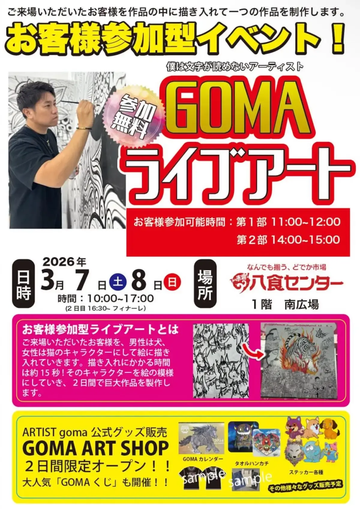 青森県八戸市の八食センター(市場棟1階 南広場)にて、2026年3月7日(土)と8日(日)の2日間、「GOMA ライブアート」が開催されます。
