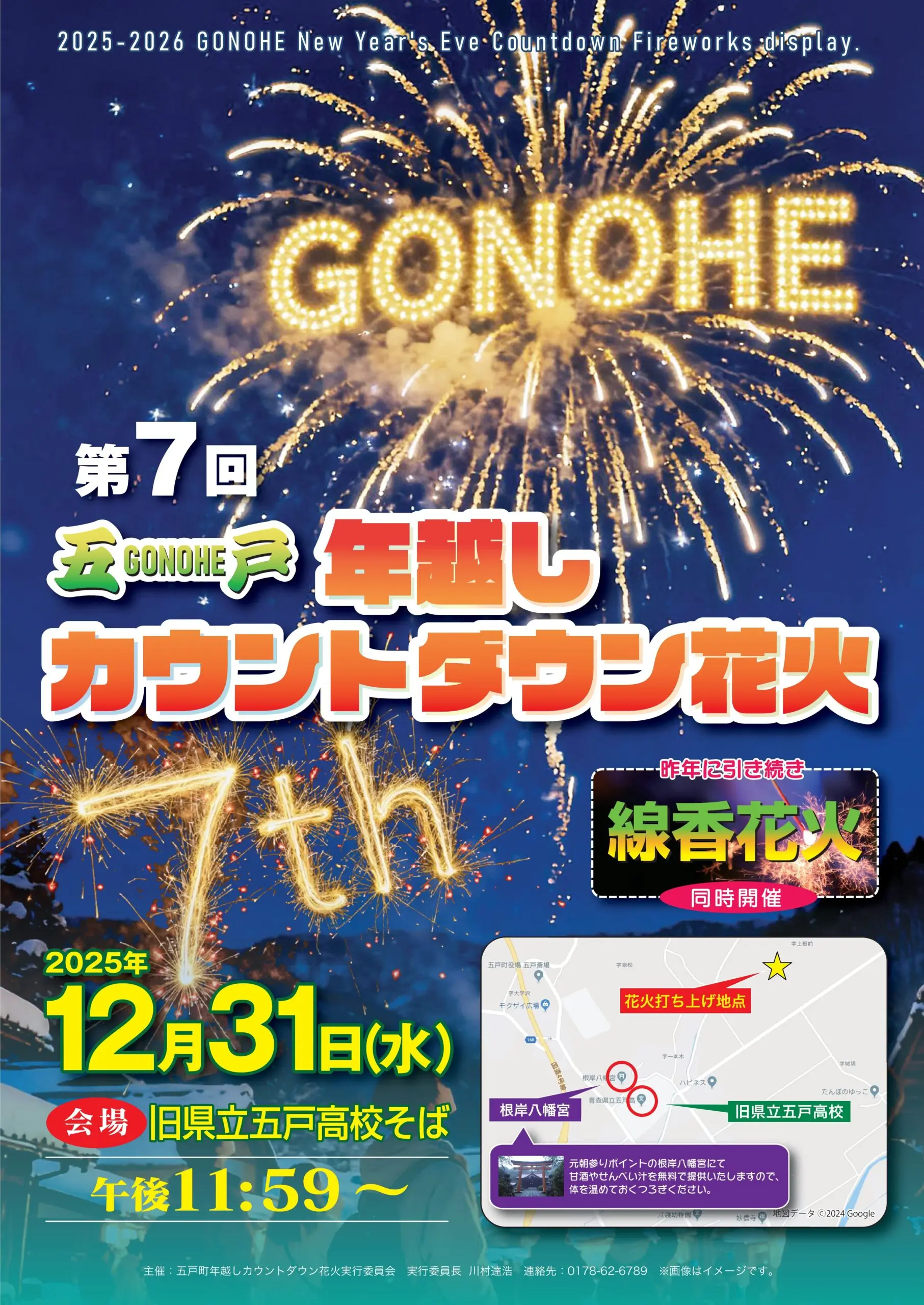 五戸町の旧県立五戸高校そばを会場に、年の瀬恒例イベント「五戸年越しカウントダウン花火2025-2026」が2025年12月31日(水)に開催されます。地域の冬の風物詩として親しまれている本イベントは、今年で第7回目を迎え、2025年への感謝と2026年への希望を込めて新年の幕開けを花火で祝います。