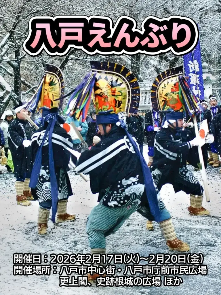 青森県八戸市の中心街や市庁前市民広場、更上閣、史跡根城の広場を会場に、国の重要無形民俗文化財に指定されている冬の伝統行事「八戸えんぶり2026」が2026年2月17日(火)から2月20日(金)まで開催されます。八戸地方に春を呼び込む豊作祈願の祭りとして知られ、太夫が馬の頭を模した烏帽子を被り、種まきや田植えなど稲作の所作を表現する独特の舞を披露します。期間中は奉納やえんぶり行列、一斉摺り、御前えんぶり、えんぶり公演、お庭えんぶり、かがり火えんぶり、一般公開、史跡根城えんぶりなど多彩な行事が行われ、歴史と文化に触れながら冬の八戸を満喫できます。