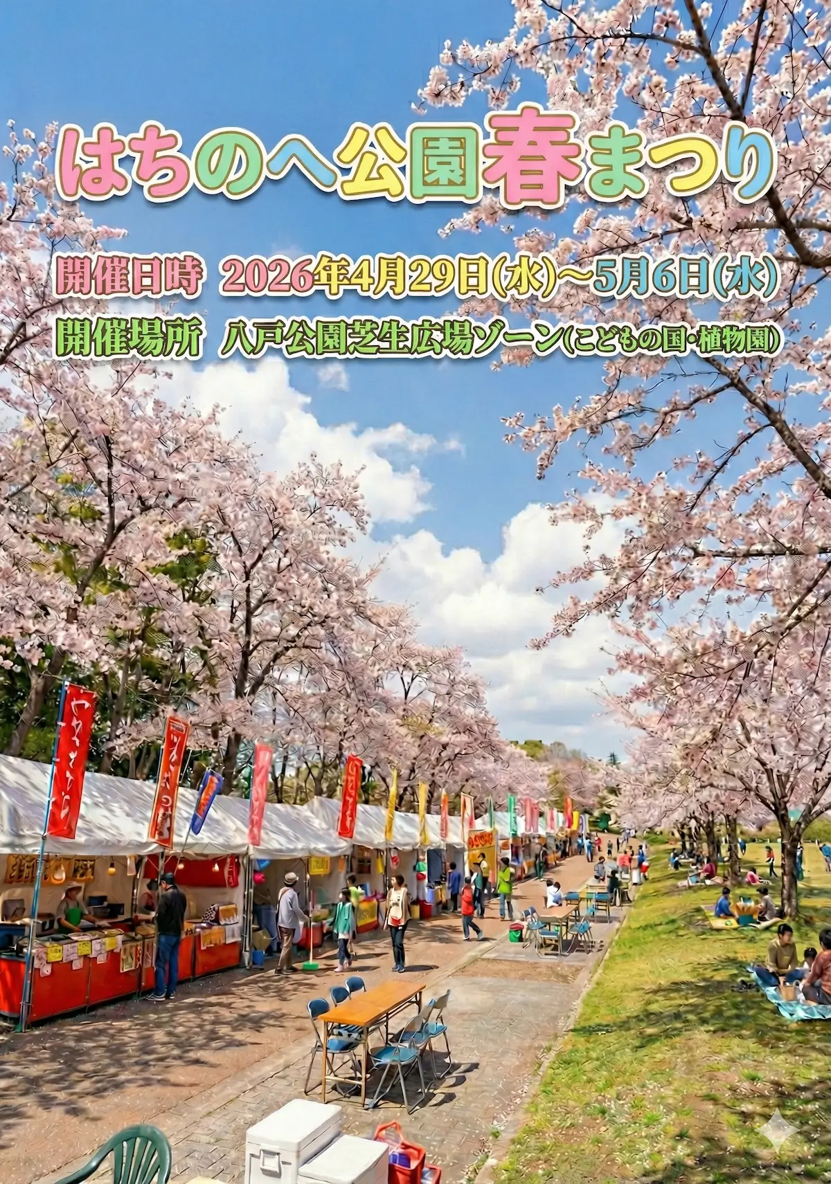 青森県八戸市の八戸公園芝生広場ゾーン(こどもの国・植物園)にて、「はちのへ公園春まつり 2026」が2026年4月29日(水)から5月6日(水)まで開催されます。約2,000本の桜が公園全域で咲き誇る、県内最大級の桜祭りです。
