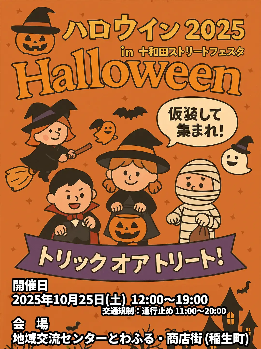 このイベントは、仮装して「トリック オア トリート!」を合言葉にお店をまわってお菓子をゲットできる、毎年恒例の人気企画です。地域交流センターとわふるからみぞぐち布団店までの商店街一帯が歩行者天国となり、子どもから大人まで楽しめるハロウィン一色の特別な一日となります。