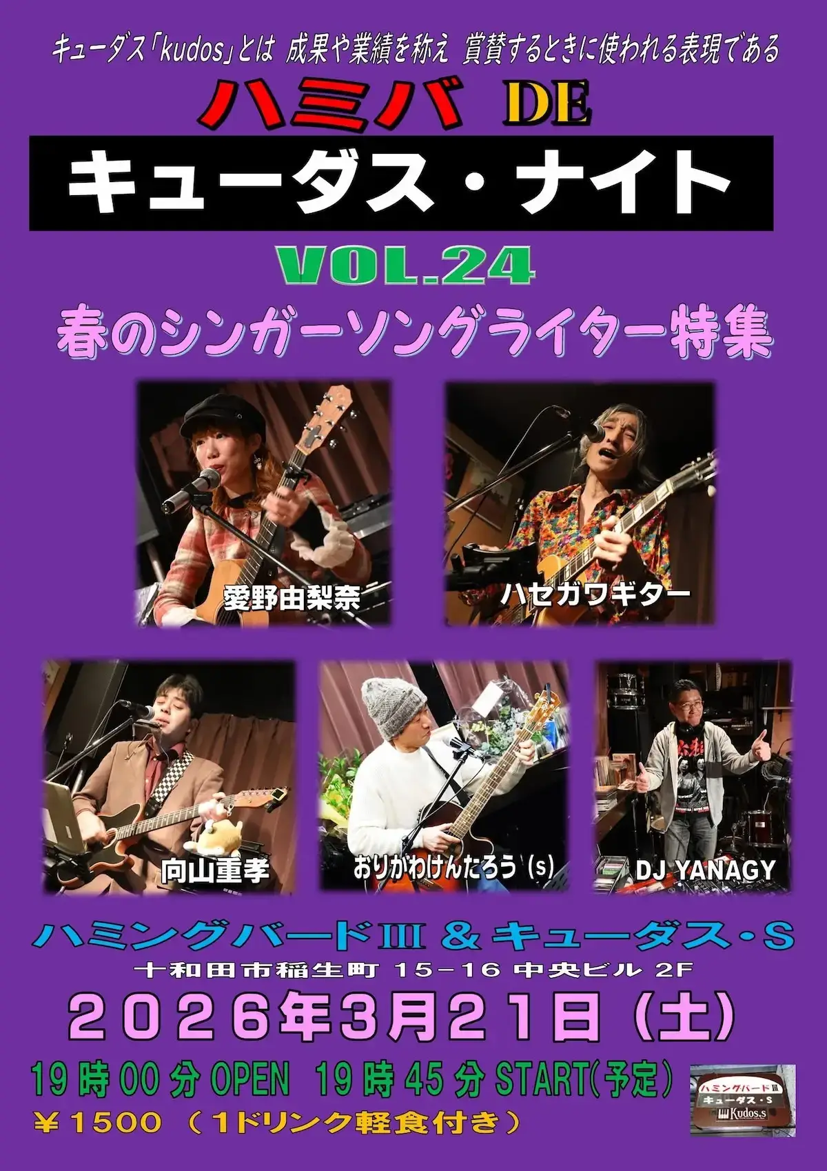 青森県十和田市の中心街にある「ハミングバード III & キューダス・S」にて、恒例の音楽イベント「ハミバDEキューダス・ナイト Vol.23」が開催されます。開催日は2026年2月21日(土)、19時オープンです。