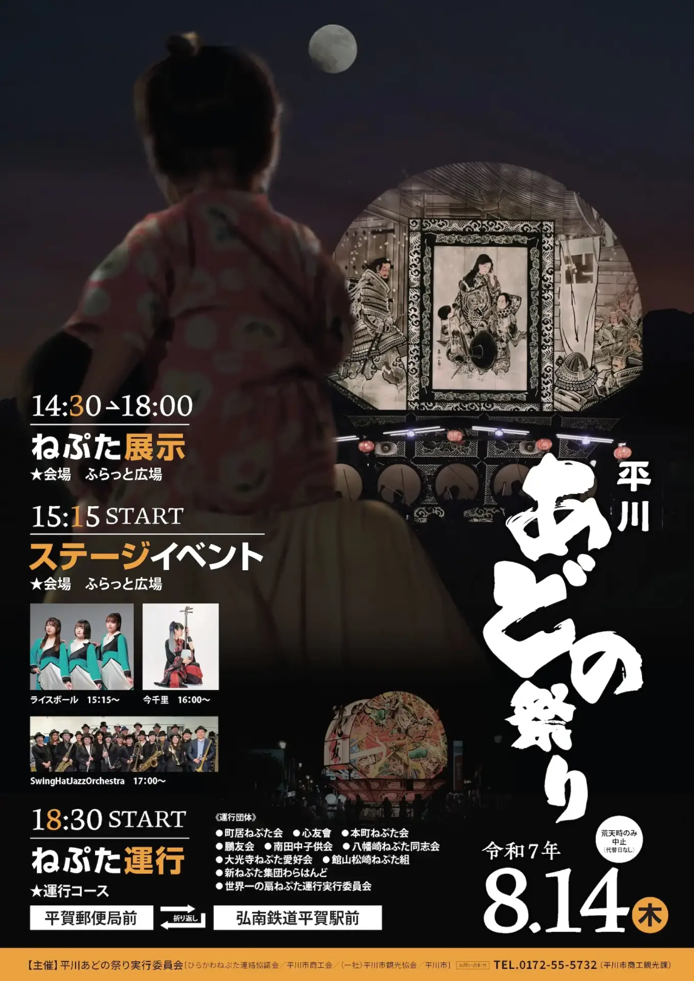 | 18:30~20:15 | ねぷた運行(コース:平賀郵便局~弘南鉄道平賀駅前) |