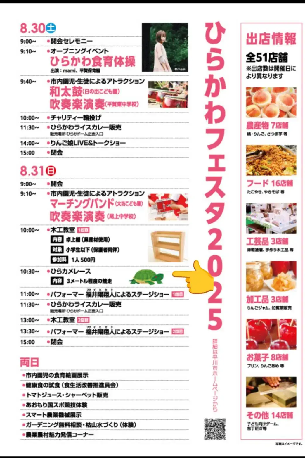 青森県平川市・ひらかドームを会場に「ひらかわフェスタ2025」が開催されます。開催日は2025年8月30日(土)・31日(日)の両日、時間は9:00~15:00。平川市の特産「津軽の桃」をはじめ、旬の農産物や加工品、フードなど全51店舗が出店し、物産・食の大集合イベントです。人気の「米粉ピーチパイ」や「ひらかわライスカレー」などの限定グルメ販売、さらにステージイベントや体験イベントも盛りだくさん。りんご娘のLIVE&トークショー、福井陽翔人さんのパフォーマンス、子どもたちによる和太鼓や吹奏楽演奏、木工教室やユニークな「ひらカメレース」など家族で楽しめる企画が用意されています。夏の平川市を彩る食と交流のフェスタにぜひお越しください。