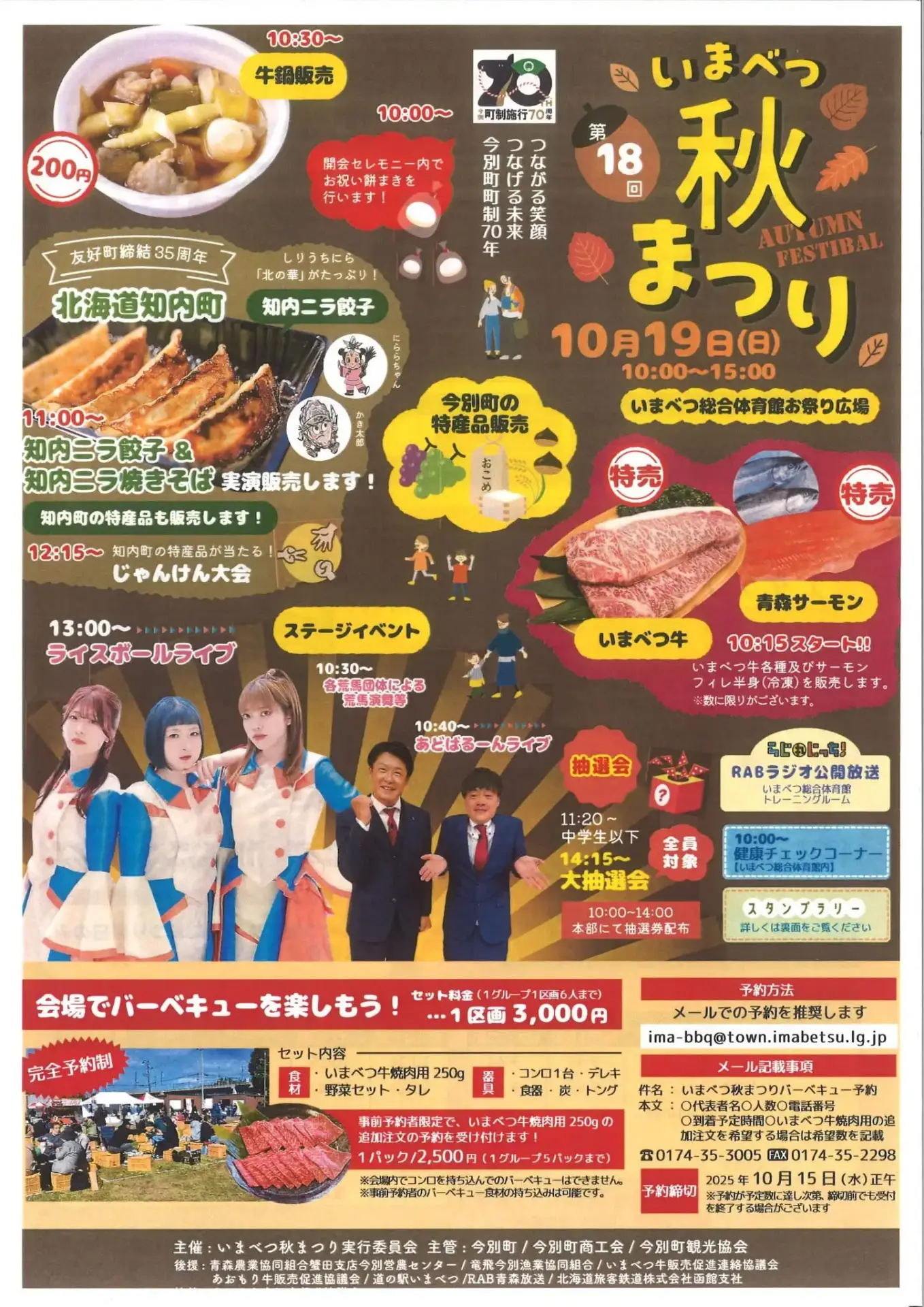 会場では、いまべつ牛・青森サーモンの特売や、知内町のニラ餃子・ニラ焼きそばの実演販売、今別町特産品の販売のほか、ステージでは「あどばるーん」や「ライスボール」のライブも行われます。