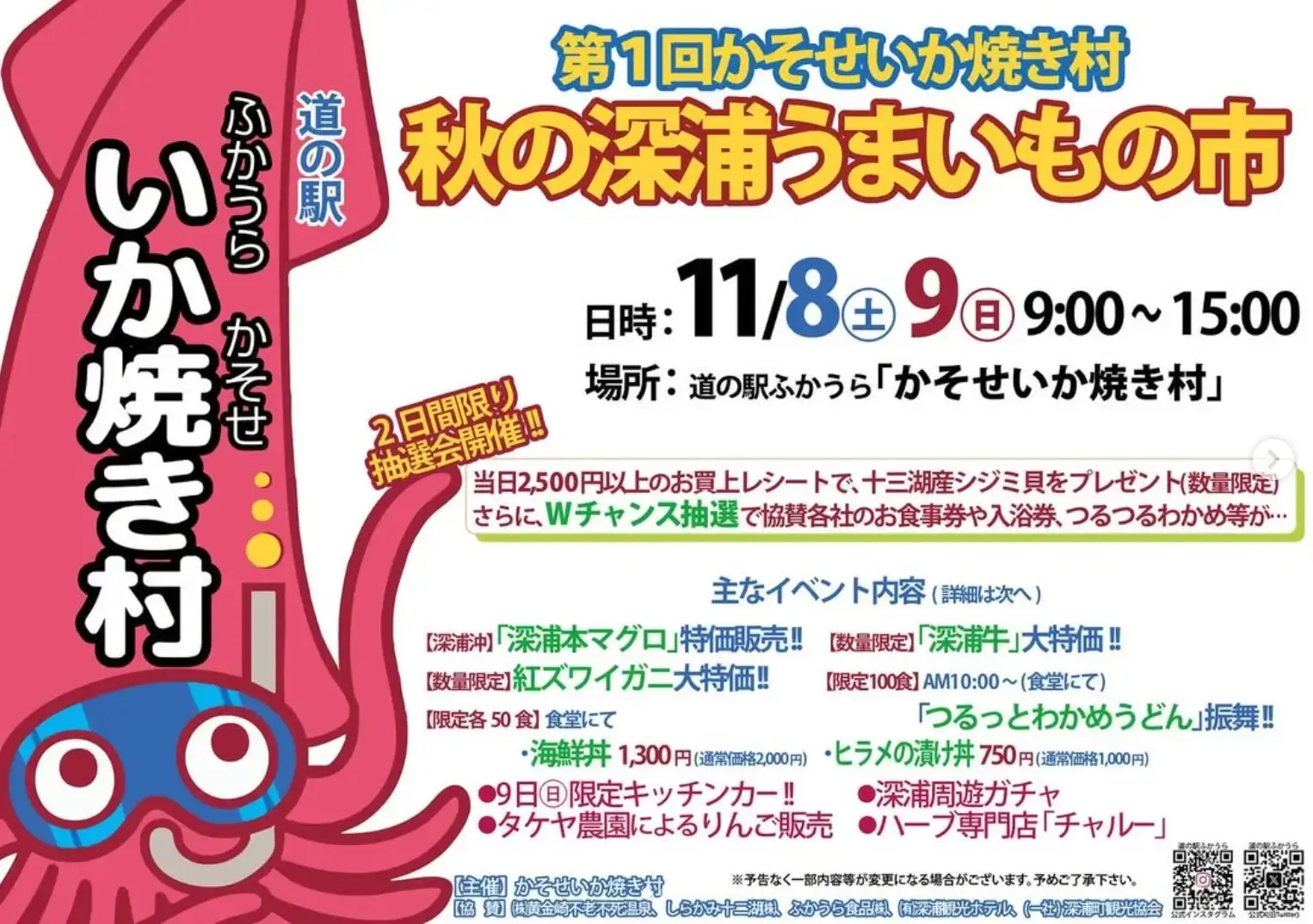 青森県深浦町の道の駅ふかうら「かそせいか焼き村」で、地元の旬の味覚が集うグルメイベント「第1回かそせいか焼き村 秋の深浦うまいもの市」が開催されます。