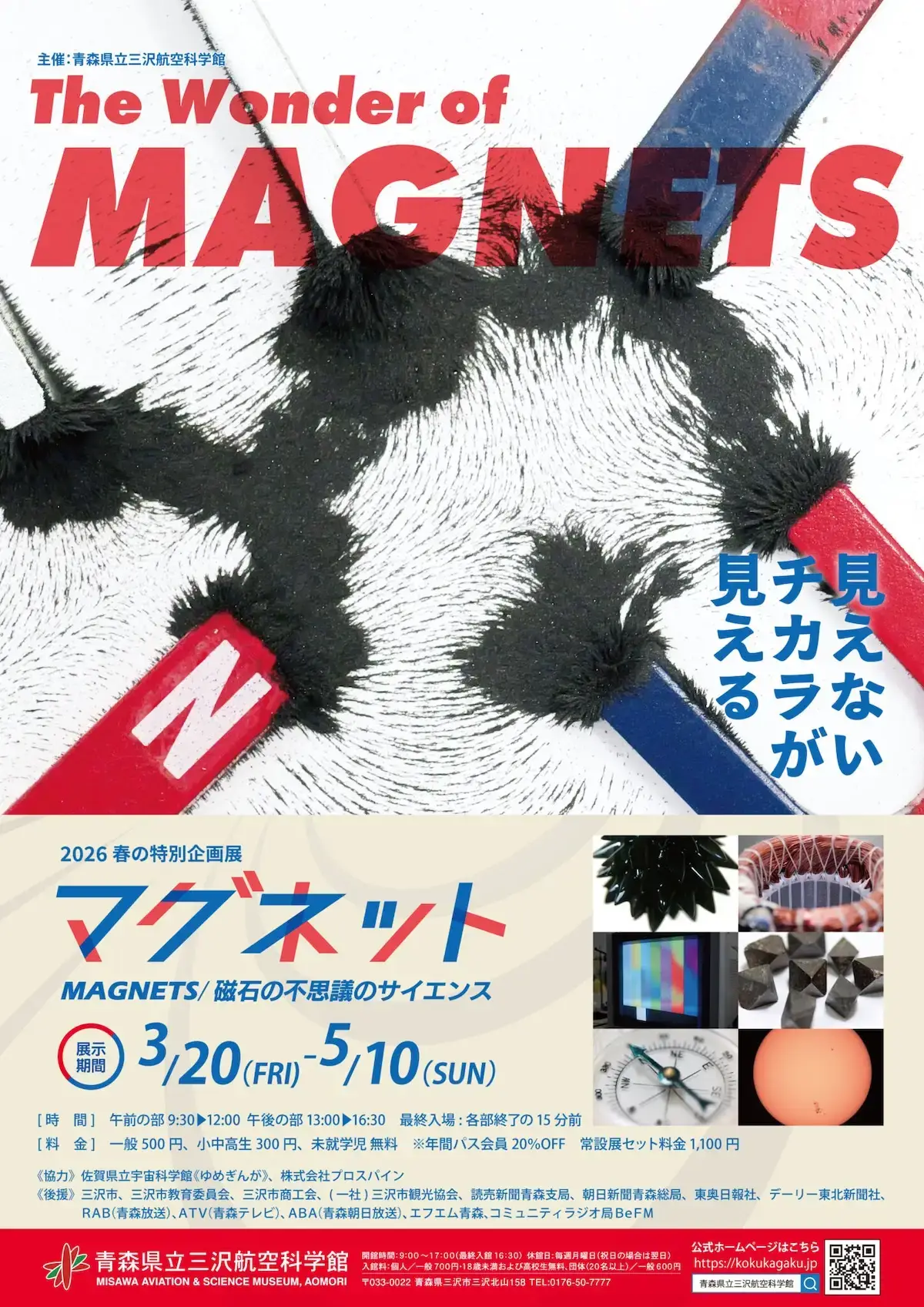 青森県三沢市にある青森県立三沢航空科学館 特別展示室にて、2026年3月20日(金)から5月10日(日)まで、春の特別企画展「マグネット展」が開催されます。IH調理器やスピーカー、医療機器など、私たちの暮らしを支えている“磁石”の力。目には見えませんが、その不思議なパワーは、実は身の回りのさまざまな場面で活躍しています。