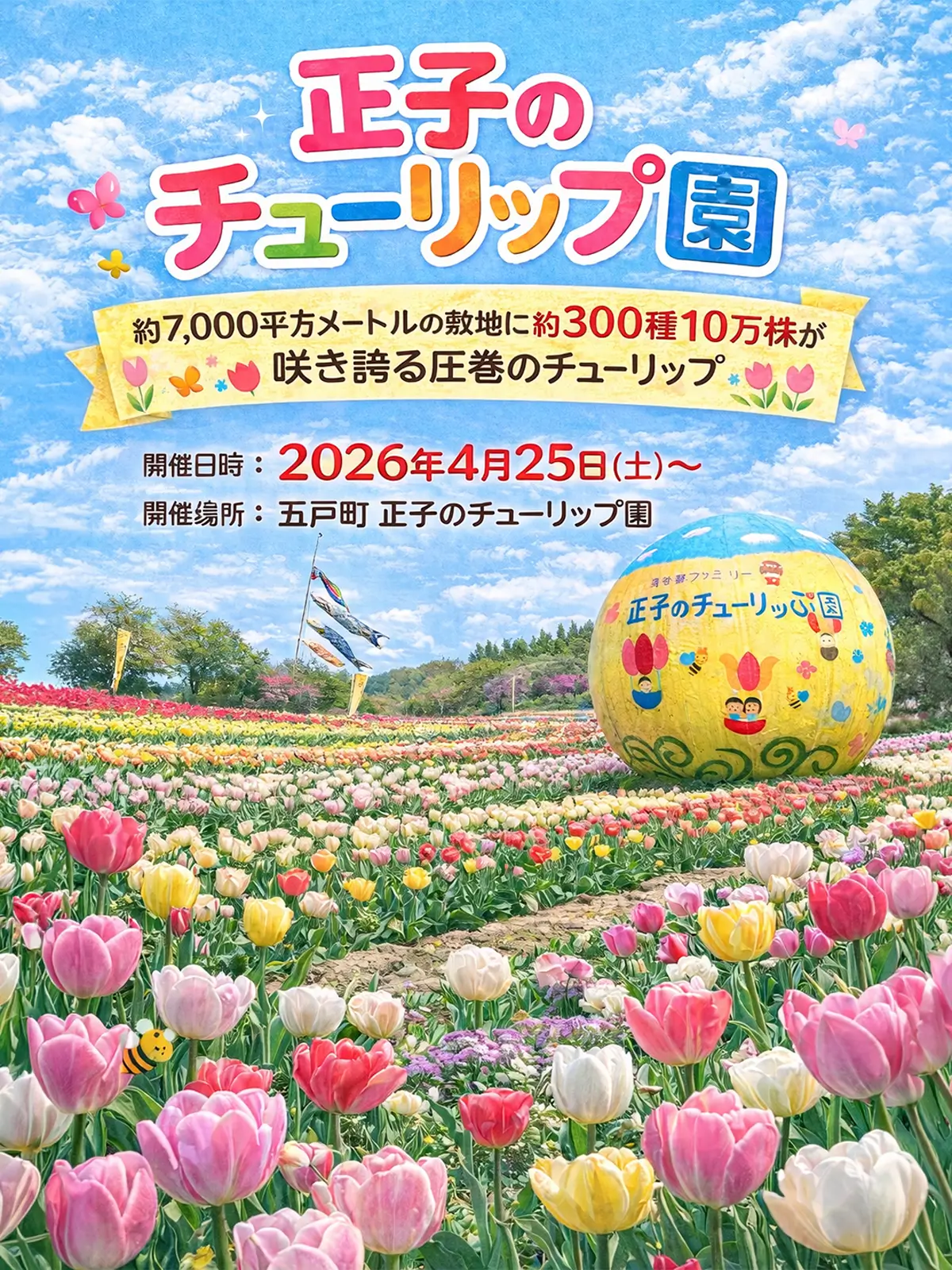 2026年は4月25日(土)から開園しており、青空と色鮮やかなチューリップのコントラストが来園者を魅了します。