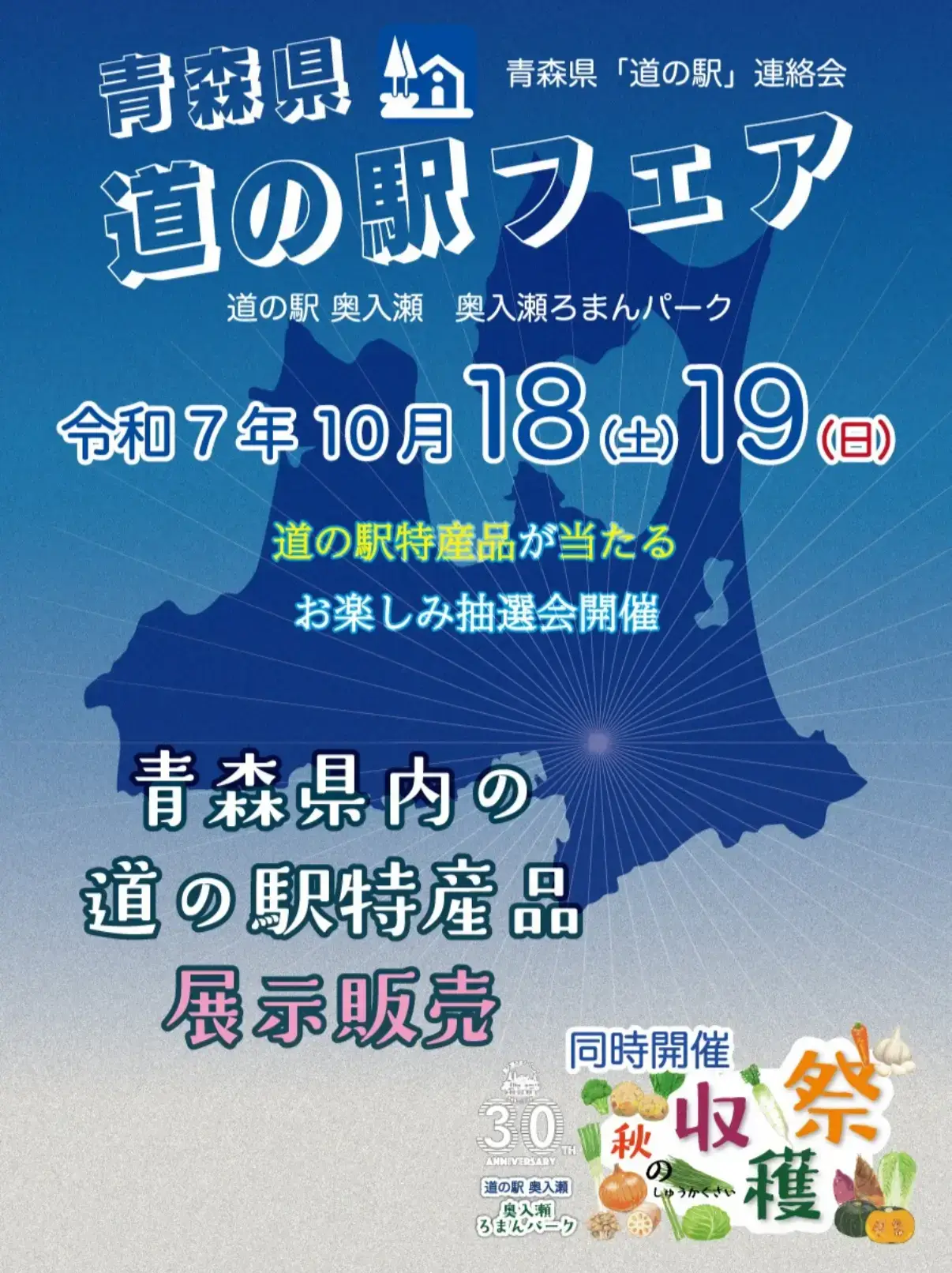 青森県十和田市の「道の駅 奥入瀬 奥入瀬ろまんパーク」を会場に、「青森県 道の駅フェア」が2025年10月18日(土)・19日(日)の2日間開催されます。青森県内の道の駅特産品が一堂に会し、展示販売が行われるほか、特産品が当たるお楽しみ抽選会も実施されます。また、同時開催イベントとして「秋の収穫祭」も行われ、旬の味覚とともに買い物や交流を楽しめる内容となっています。