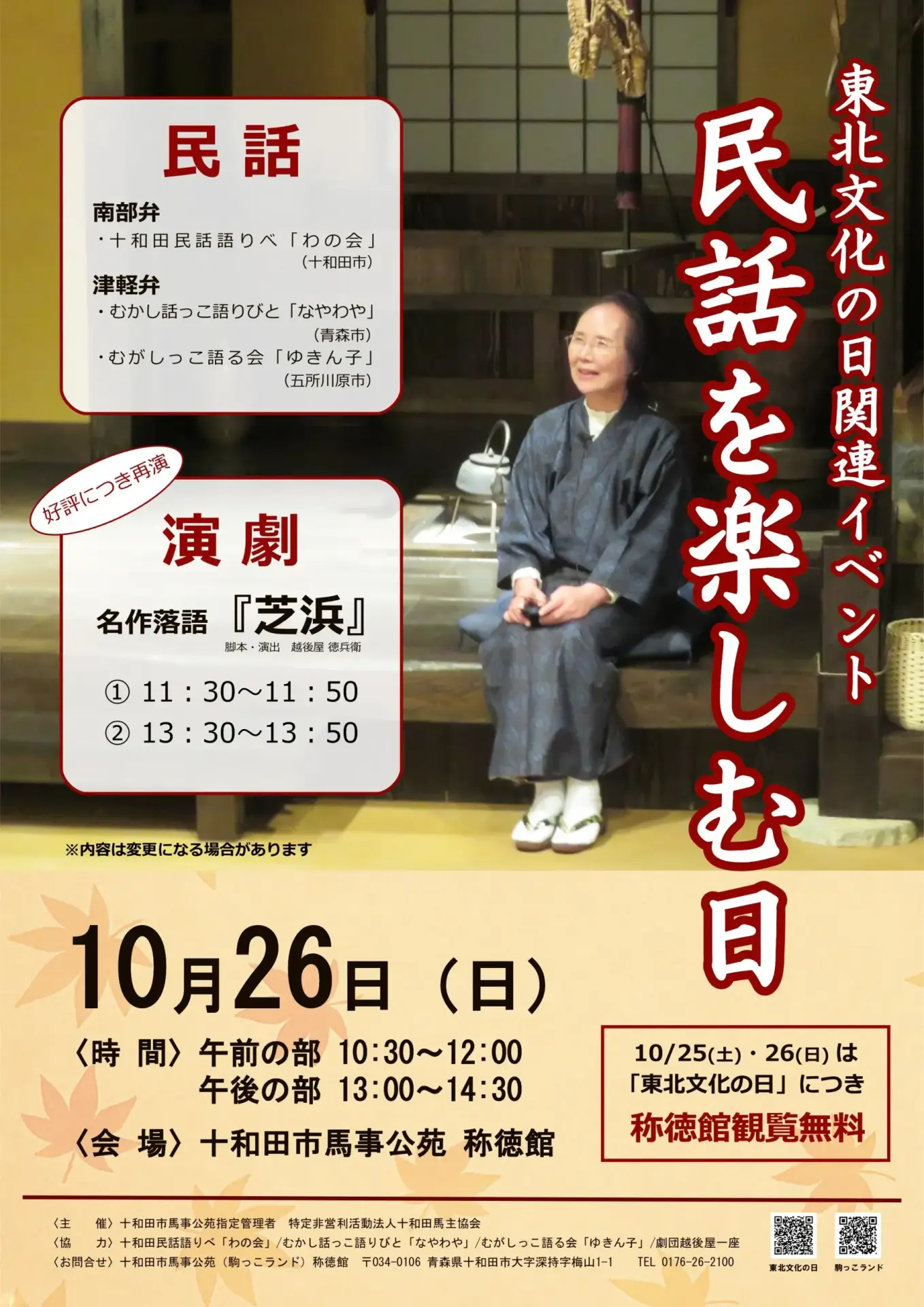 青森県十和田市の駒っこランド称徳館を会場に、2025年10月26日(日)、「民話を楽しむ日」が開催されます。