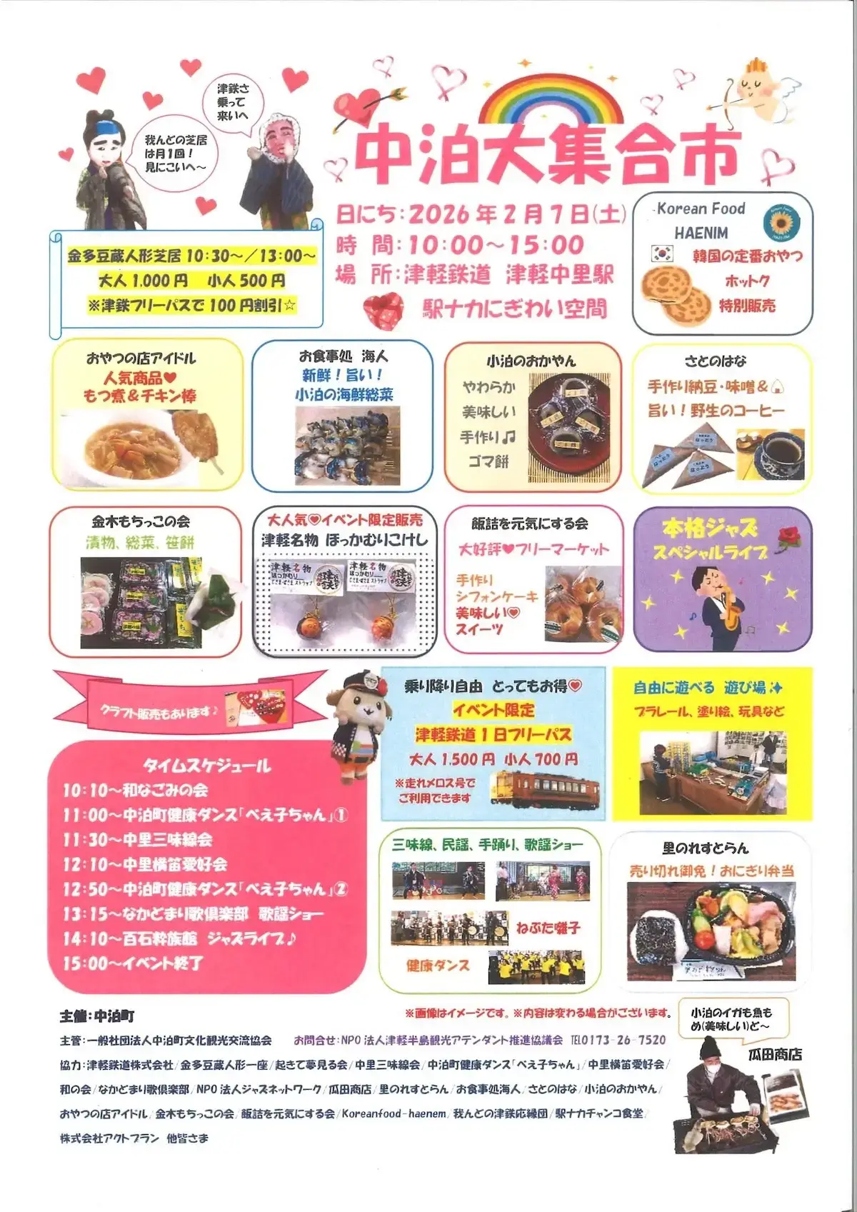 2026年2月7日(土)、青森県中泊町の津軽鉄道の津軽中里駅にある駅ナカ「にぎわい空間」にて、「中泊大集合市」が開催されます。美味しいグルメや雑貨の販売に加え、ジャズライブや三味線演奏などのステージイベントも楽しめる、盛りだくさんのイベントです。
