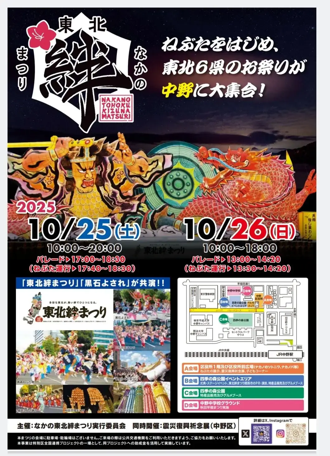 会場では東北の特産品やグルメの販売、ステージイベント、ねぶた運行など多彩なプログラムが実施され、地域の魅力を東京・中野で体感できる2日間となります。
