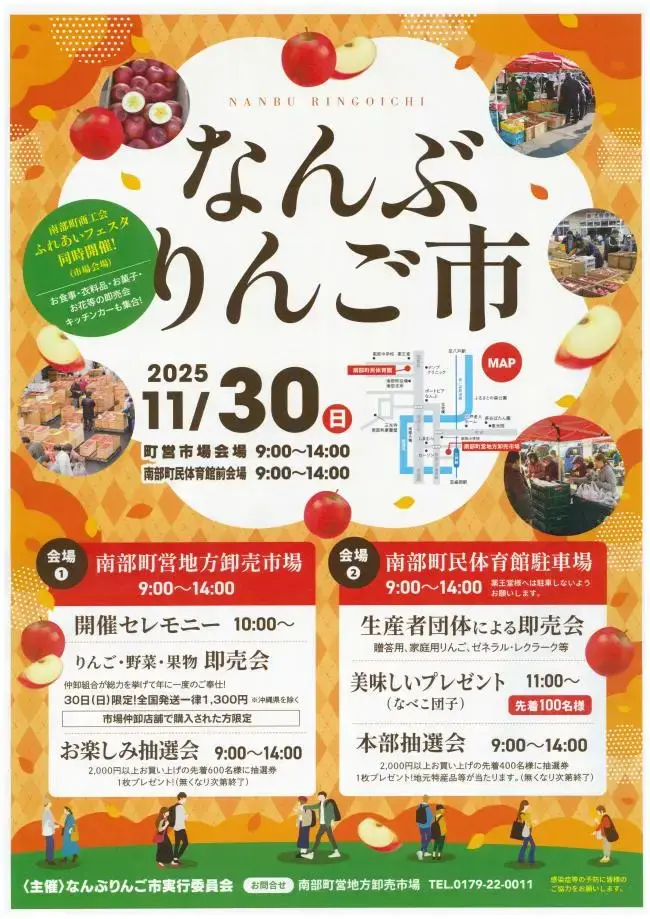 なんぶりんご市実行委員会(南部町営地方卸売市場)TEL:0179-22-0011