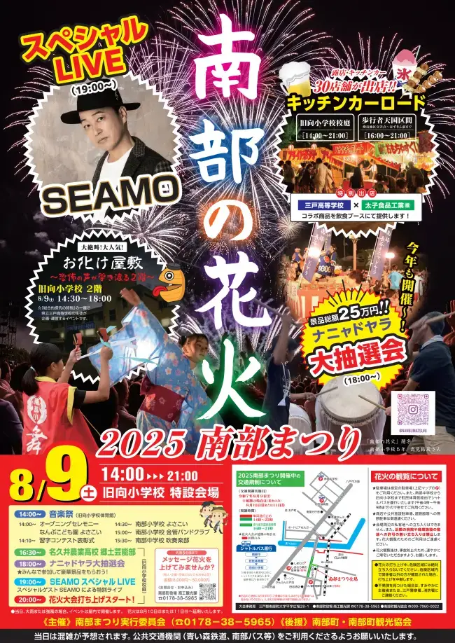 青森県南部町で開催される「南部の花火まつり2025」は、2025年8月9日(土)14:00〜21:00、旧南部町立向小学校特設会場をメインに開催されます。地元児童生徒による音楽演奏や演舞をはじめ、人気アーティストSEAMOによるスペシャルライブ、ナニャドヤラ大抽選会、お化け屋敷などの多彩なイベントが展開されます。夕方からは30店舗以上の露店・キッチンカーが並び、グルメも充実。締めくくりには古牧橋周辺から花火が打ち上げられ、南部町の夏を盛大に彩ります。