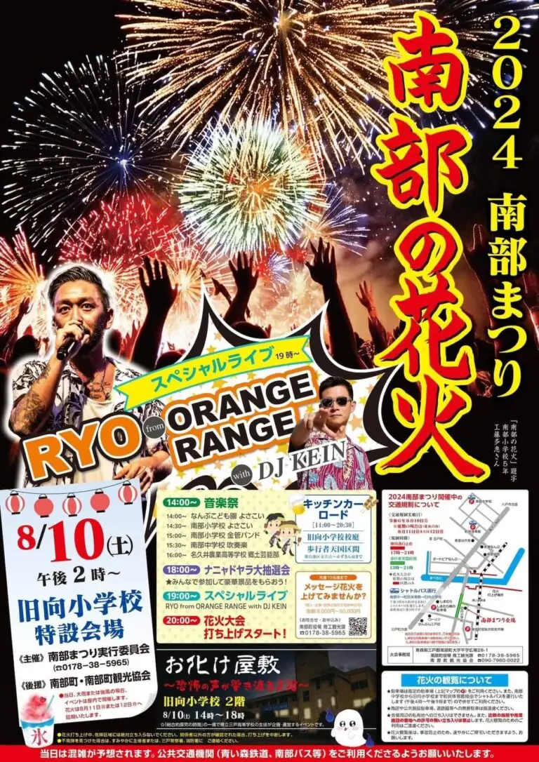 また、旧向小学校をお祭り広場として、なんぶこども園 よさこい、南部小学校 よさこい、南部小学校 金管バンド、南部中学校 吹奏楽、名久井農業高等学校 郷土芸能部、ナニャドヤラ大抽選会のステージイベントが行われ、特設イベントとしてお化け屋敷~恐怖の声が響き渡る2階~も開催されます。会場周辺は歩行者天国となりキッチンカーの営業が行われます。