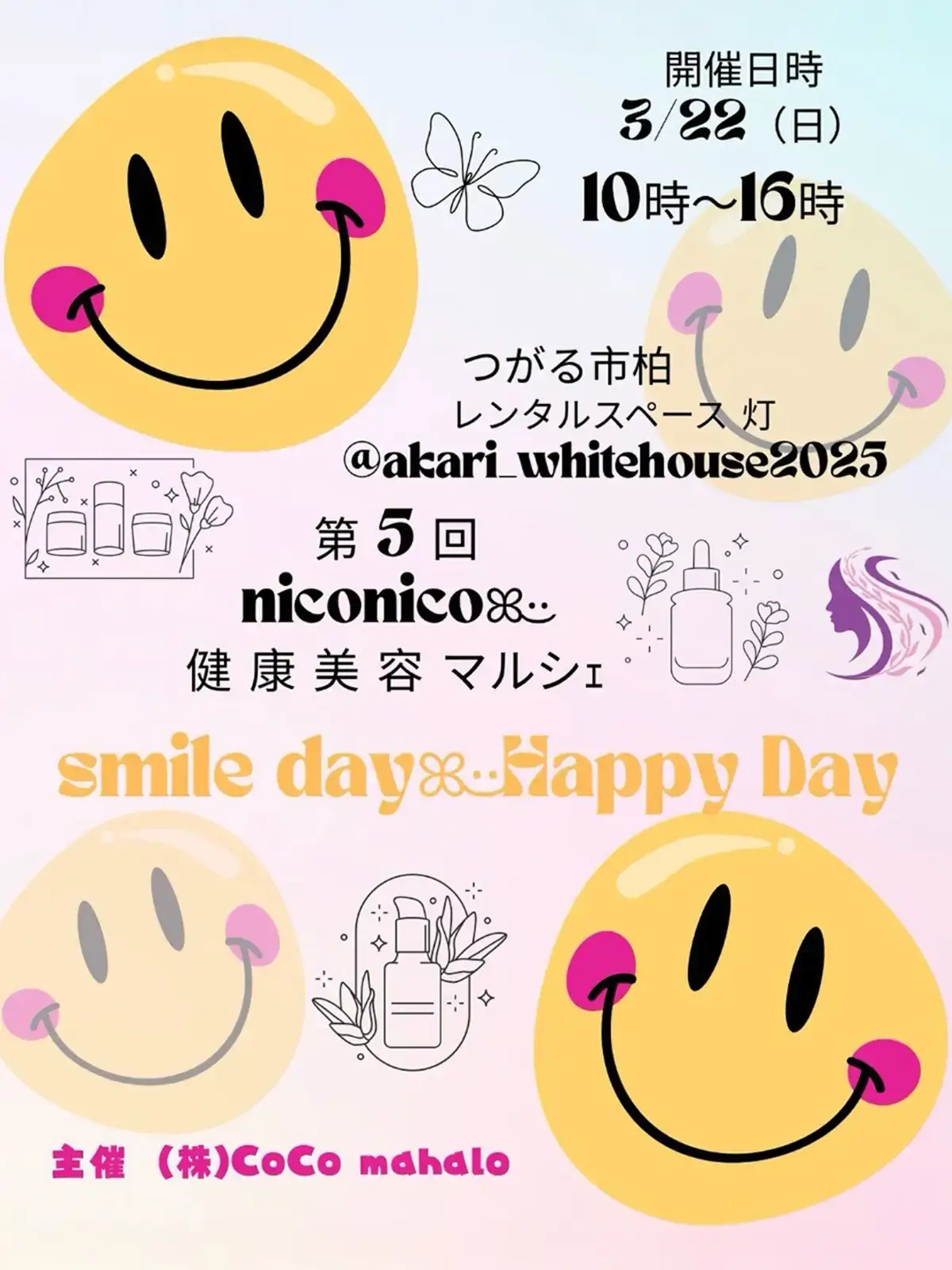 青森県つがる市の「レンタルスペース 灯り」にて、2026年3月22日(日)の10:00から16:00まで、「第5回 niconico 健康 美容 マルシェ」が開催されます。心と体を癒やし、笑顔あふれる「smile day Happy Day」をテーマにしたイベントです。