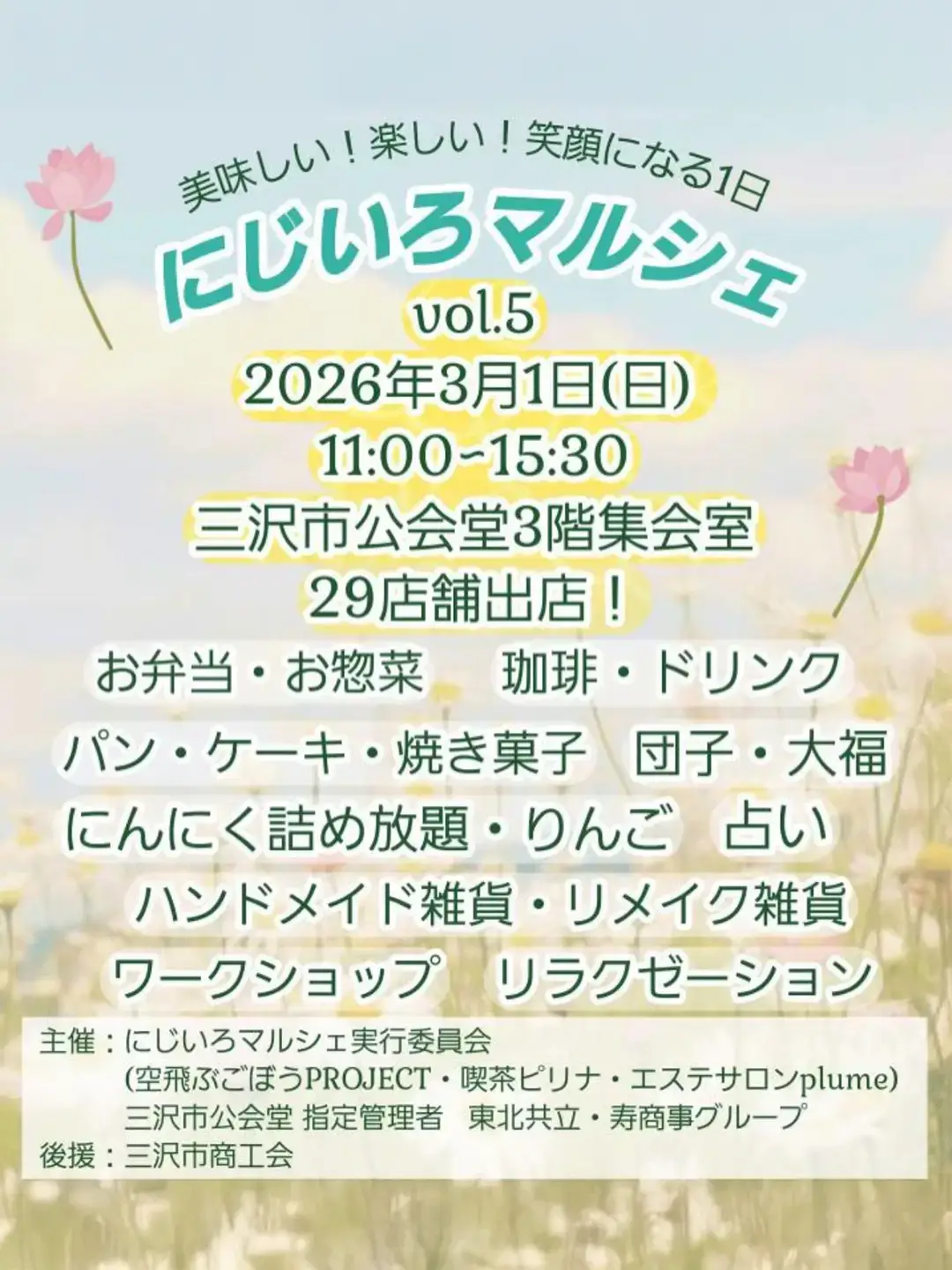 2026年3月1日(日)、青森県三沢市の「三沢市公会堂」にて、今回で5回目となる「にじいろマルシェ vol.5」が開催されます。