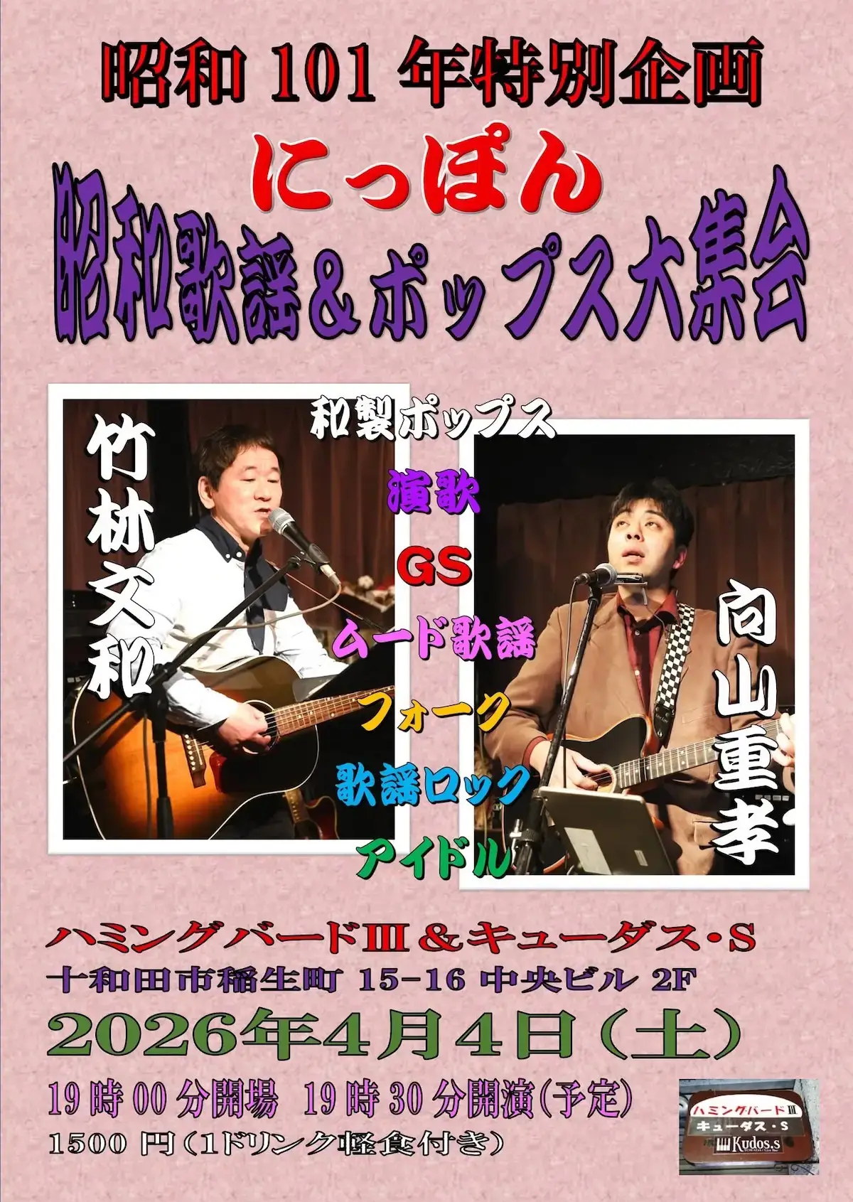 青森県十和田市のハミングバードⅢ&キューダス・Sにて、2026年4月4日(土)に「にっぽん昭和歌謡&ポップス大集会」が開催されます。八戸市から竹林文和氏、十和田市から向山重孝氏が出演し、和製ポップス・演歌・グループサウンズ・フォークなど様々なジャンルからお気に入りの曲を披露するライブイベントです。