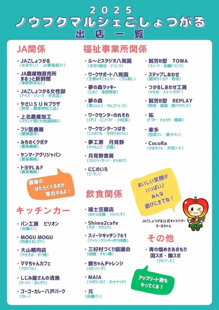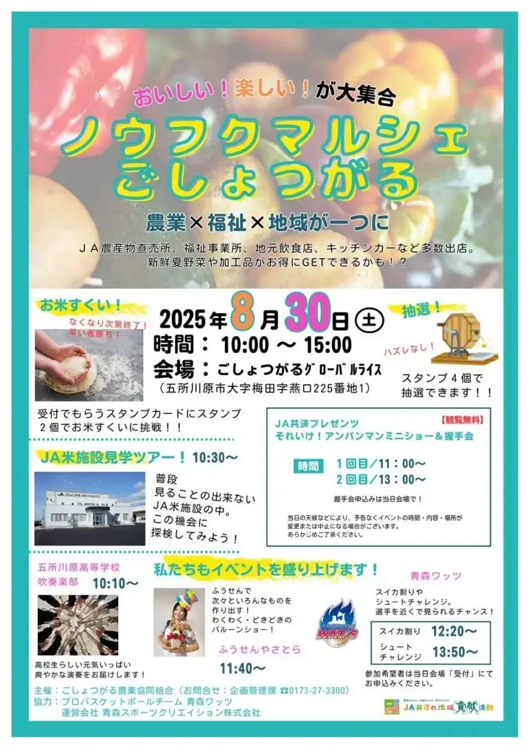 青森県五所川原市の ごしょつがるグローバルライス を会場に、「ノウフクマルシェ ごしょつがる 2025」が開催されます。開催日は 2025年8月30日(土)10:00~15:00。