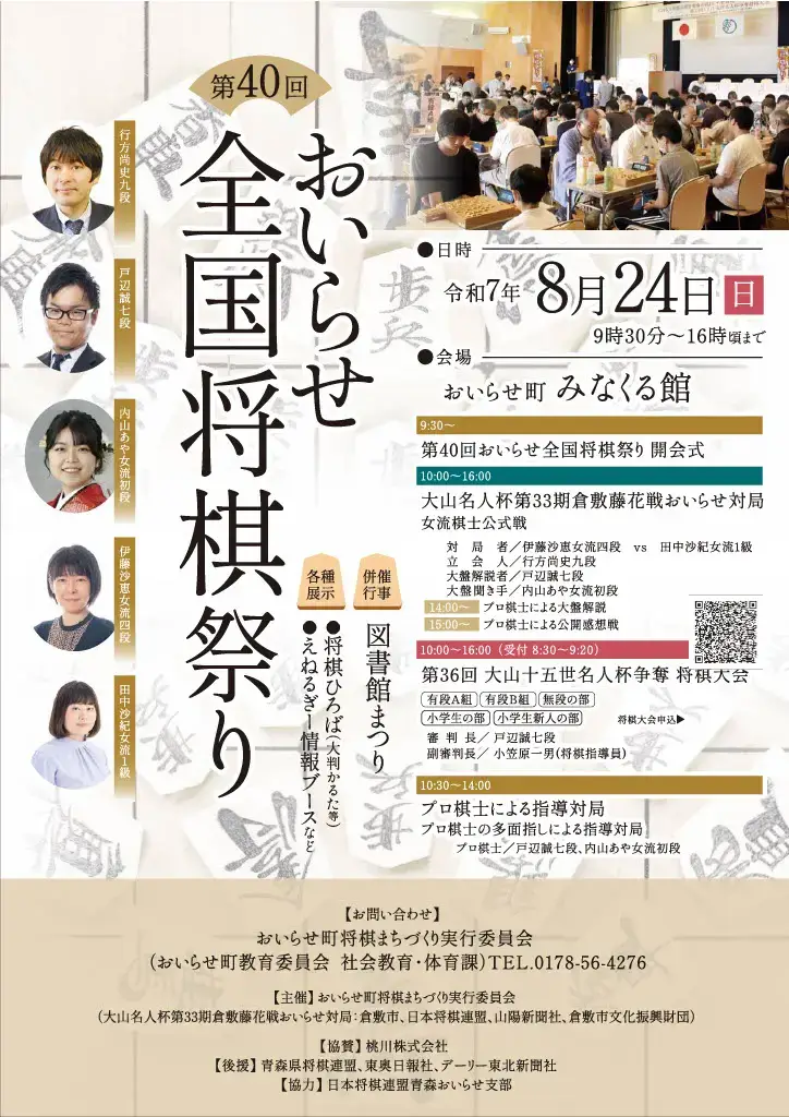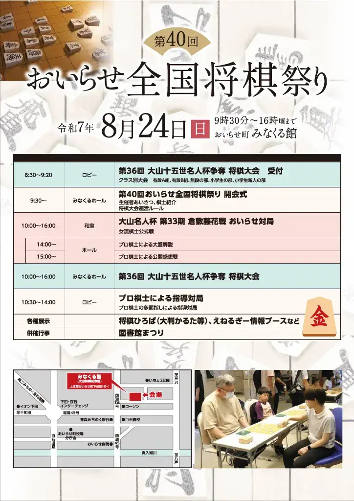 青森県おいらせ町のみなくる館にて、将棋文化の振興を目的とした「第40回おいらせ全国将棋祭り」が、2025年(令和7年)8月24日(日)9時30分から16時頃まで開催されます。恒例の「大山十五世名人杯争奪将棋大会」をはじめ、プロ棋士による指導対局や大盤解説、公開感想戦などが行われ、将棋ファン必見の一日です。さらに今年は、第33期倉敷藤花戦おいらせ対局として伊藤沙恵女流四段と田中沙紀女流1級の公式戦が実施され、熱戦を間近で観戦できます。会場では将棋ひろば(大判かるた体験など)、図書館まつり、えねるぎー情報ブースも同時開催され、子どもから大人まで楽しめる内容となっています。