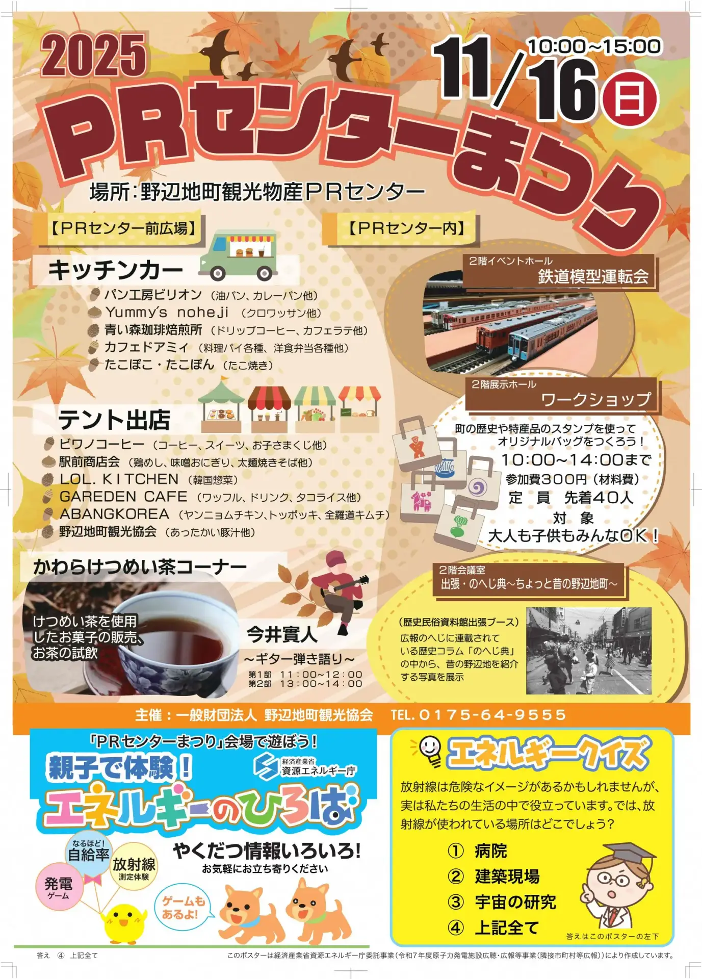 青森県野辺地町の 野辺地町観光物産PRセンター を会場に、地域の魅力が集まる秋のイベント 「PRセンターまつり2025」 が開催されます。開催日は 2025年11月16日(日)、時間は 10:00〜15:00。会場前広場にはキッチンカーやテント出店が並び、スイーツから軽食まで多彩なフードを楽しめます。さらに、今井實人さんによるギター弾き語りや、鉄道模型運転会、オリジナルバッグ作りワークショップ、昔の野辺地町を紹介する写真展示など、子どもから大人まで楽しめる企画が充実しています。秋の休日に、ぜひPRセンターへお出かけください。