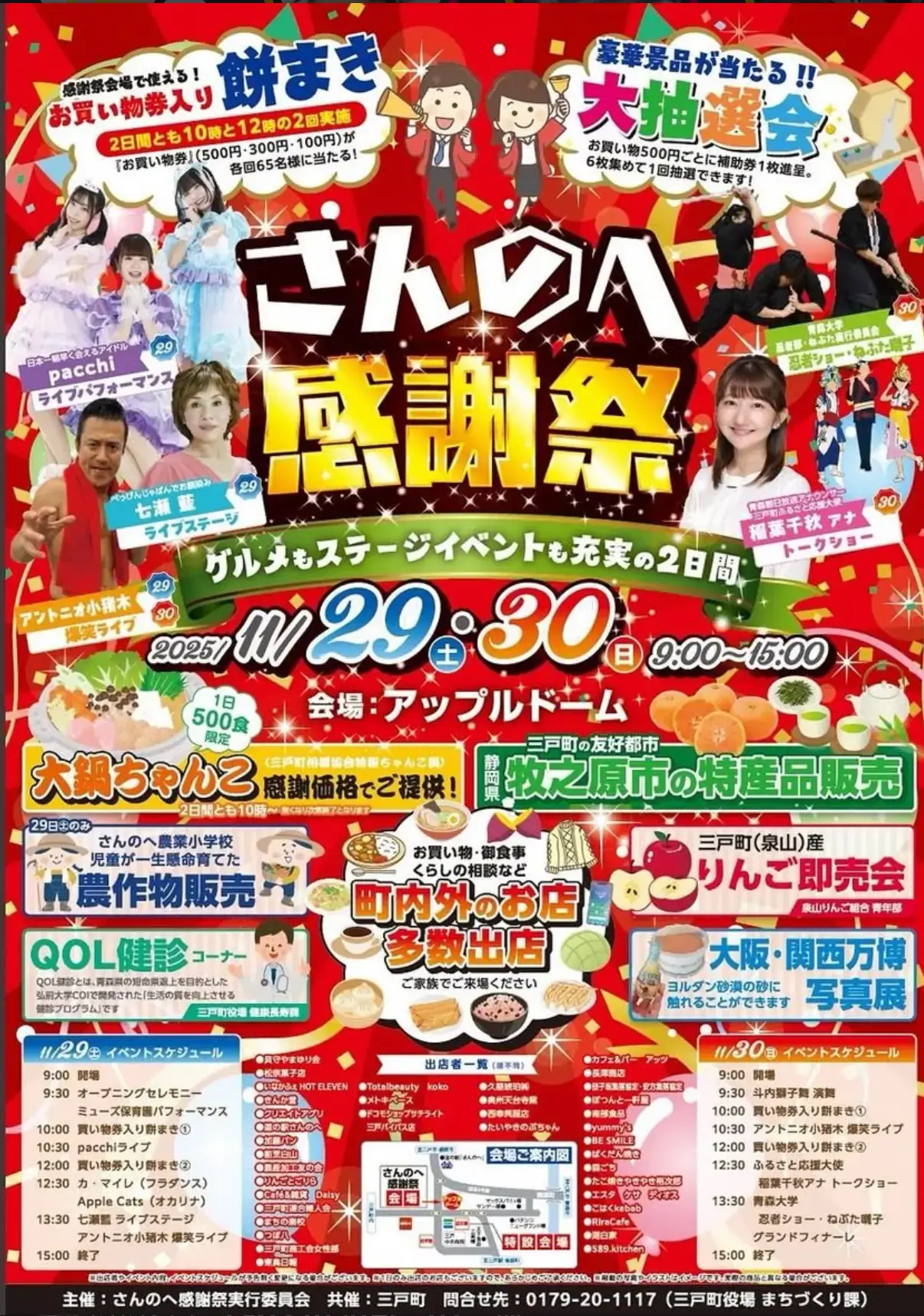 青森県三戸町のアップルドームを会場に、地域の魅力を詰め込んだ「さんのへ感謝祭2025」が開催されます。