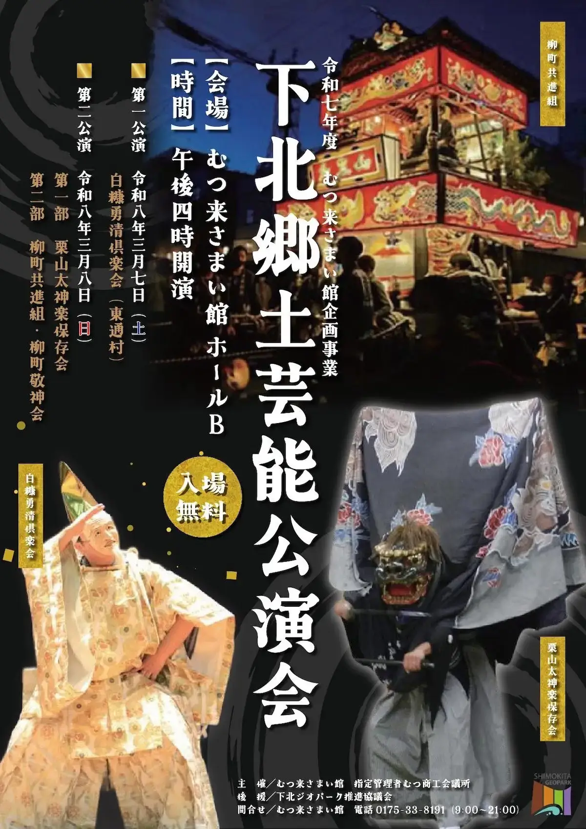初日は東通村の白糠勇清倶楽会、2日目は栗山太神楽保存会や柳町共進組・柳町敬神会が出演予定です。入場は無料で、どなたでも気軽に臨場感あふれる公演をご覧いただけます。