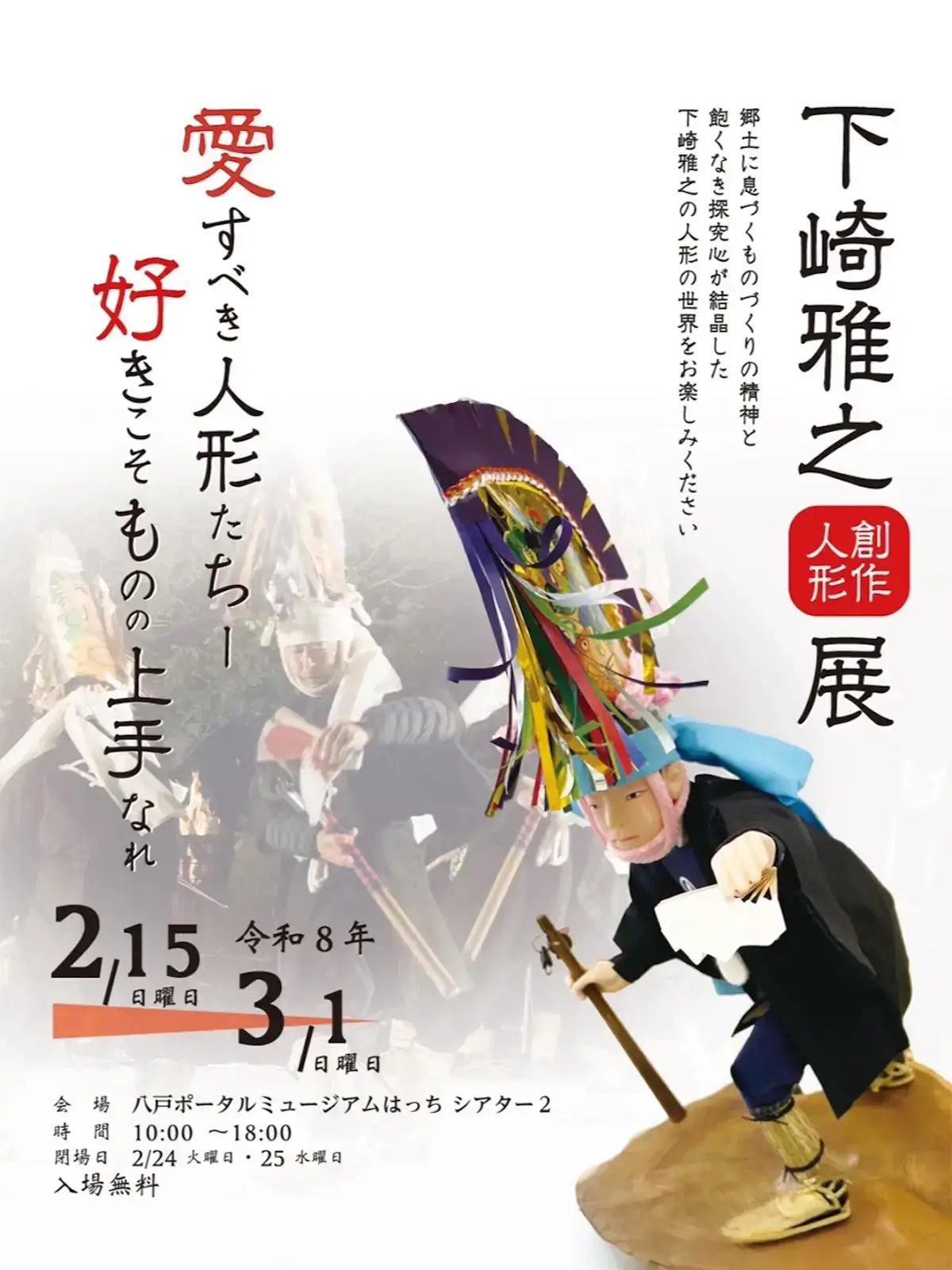 青森県八戸市の中心街「八戸ポータルミュージアムはっち」にて、郷土への温かな眼差しを感じる展覧会「下崎雅之展 ―愛すべき人形たち-好きこそものの上手なれ―」が開催されています。2026年2月15日(日)から3月1日(日)までの期間、入場無料でご覧いただけます。
