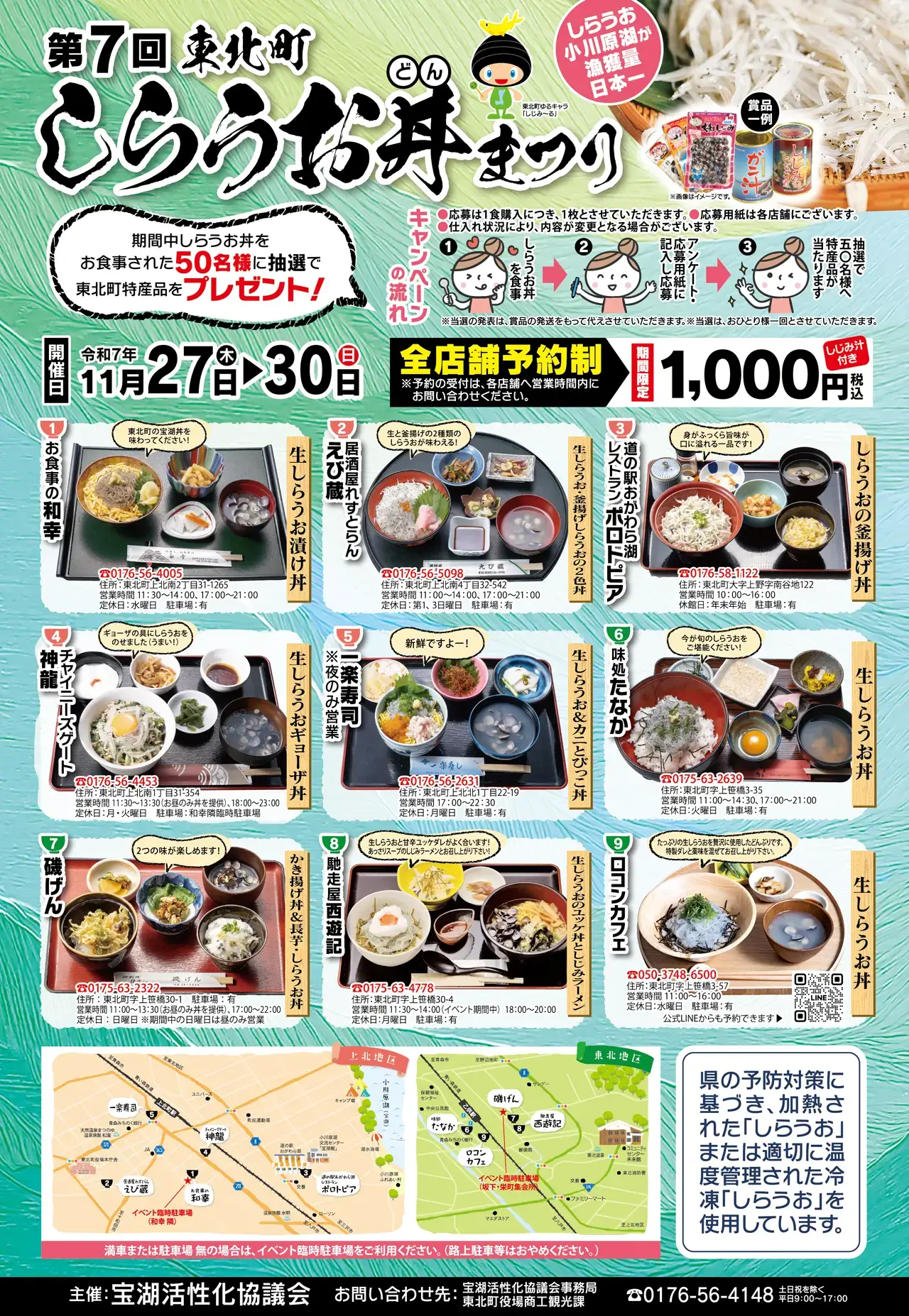 生しらうおや釜揚げしらうお、長芋やかき揚げとの組み合わせなど、店舗ごとに異なる味わいが楽しめる東北町ならではのグルメイベントです。