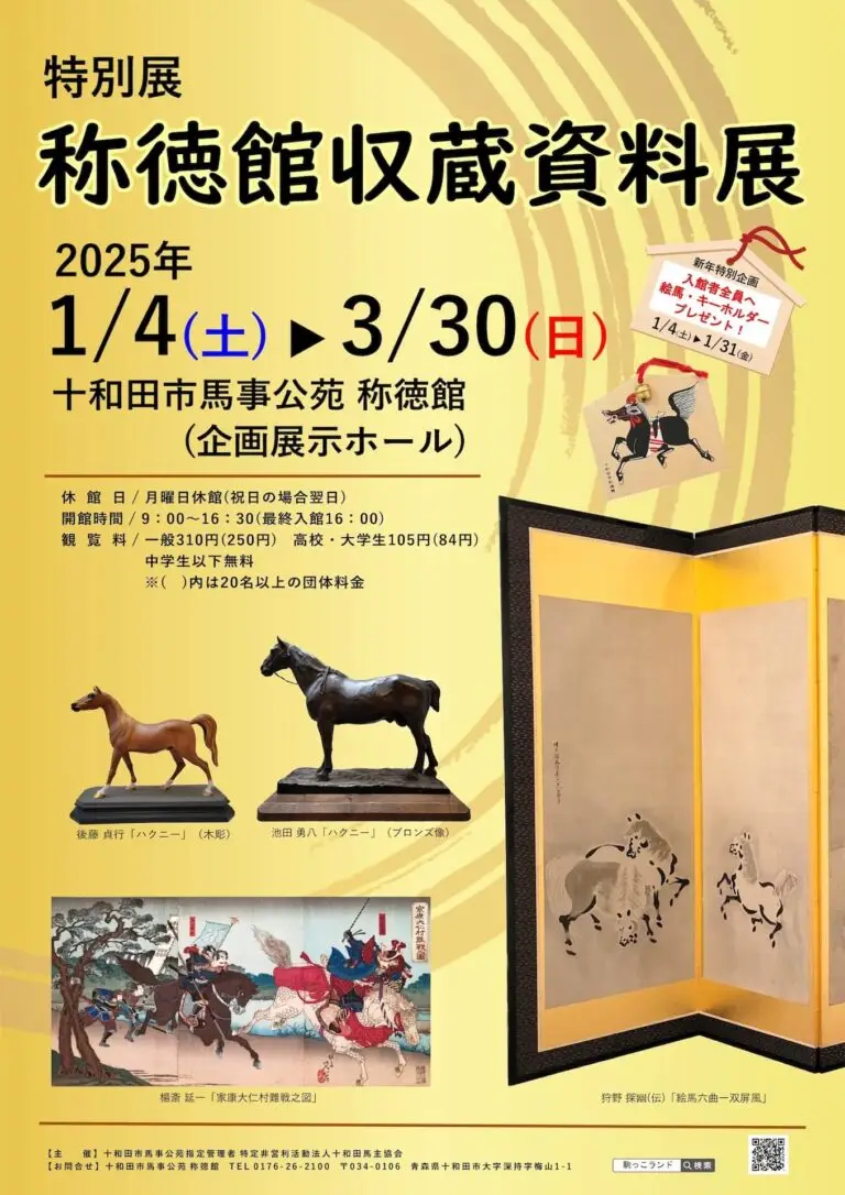 青森県十和田市、馬事公苑 称徳館で開催される特別展「称徳館収蔵資料展」。称徳館の収蔵資料の中から、明治時代の彫刻家である後藤貞行の木彫や、池田勇八のブロンズ像、狩野探幽(伝)の屏風、錦絵などを展示します。期間限定イベントですので、この機会に十和田市馬事公苑 称徳館へお越しください。イベントの詳しい情報はホームページからご確認ください。