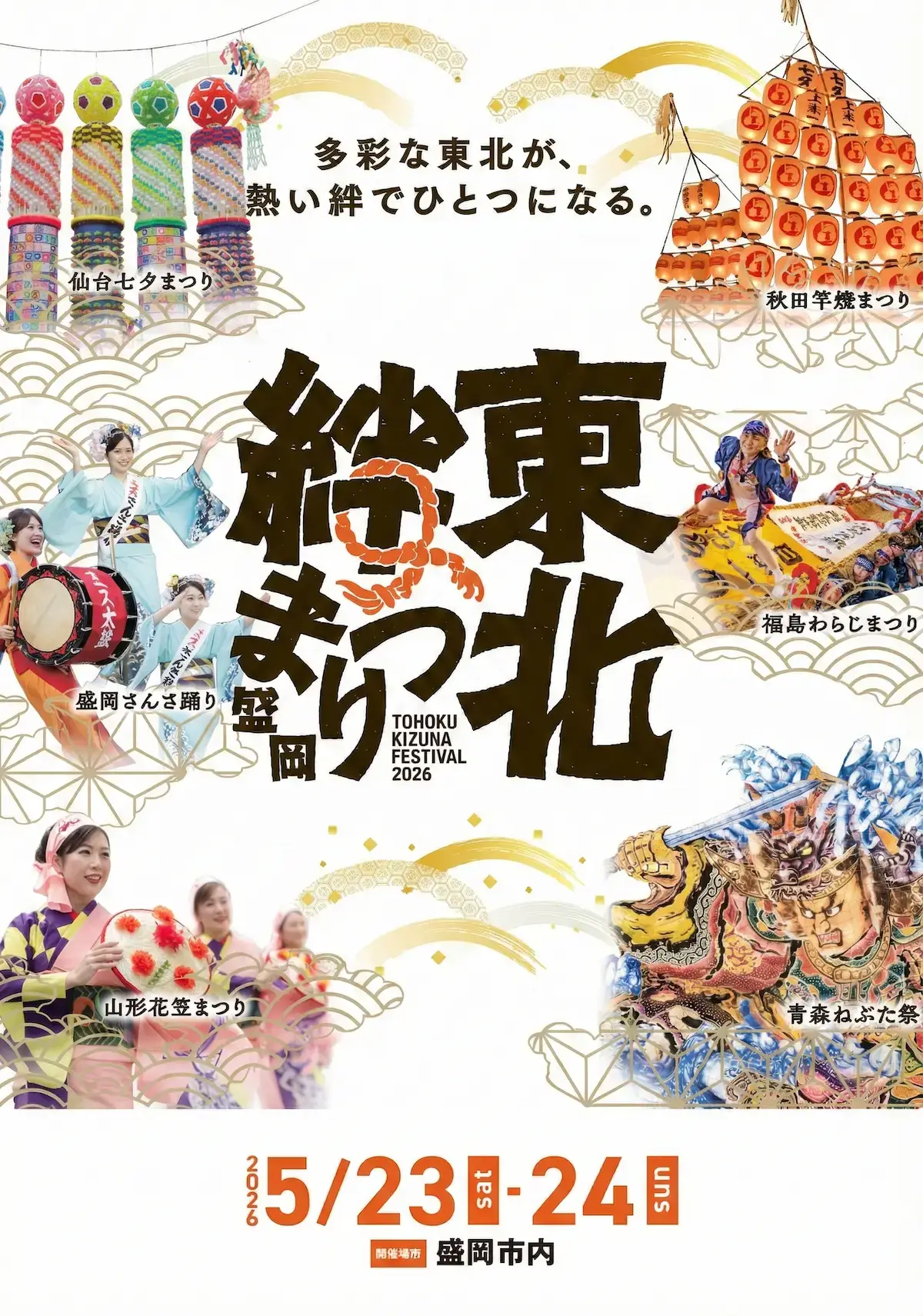 2026年5月23日(土)・24日(日)の2日間、岩手県盛岡市にて「東北絆まつり2026盛岡」が開催されます。多彩な東北が熱い絆でひとつになる、一大イベントです。