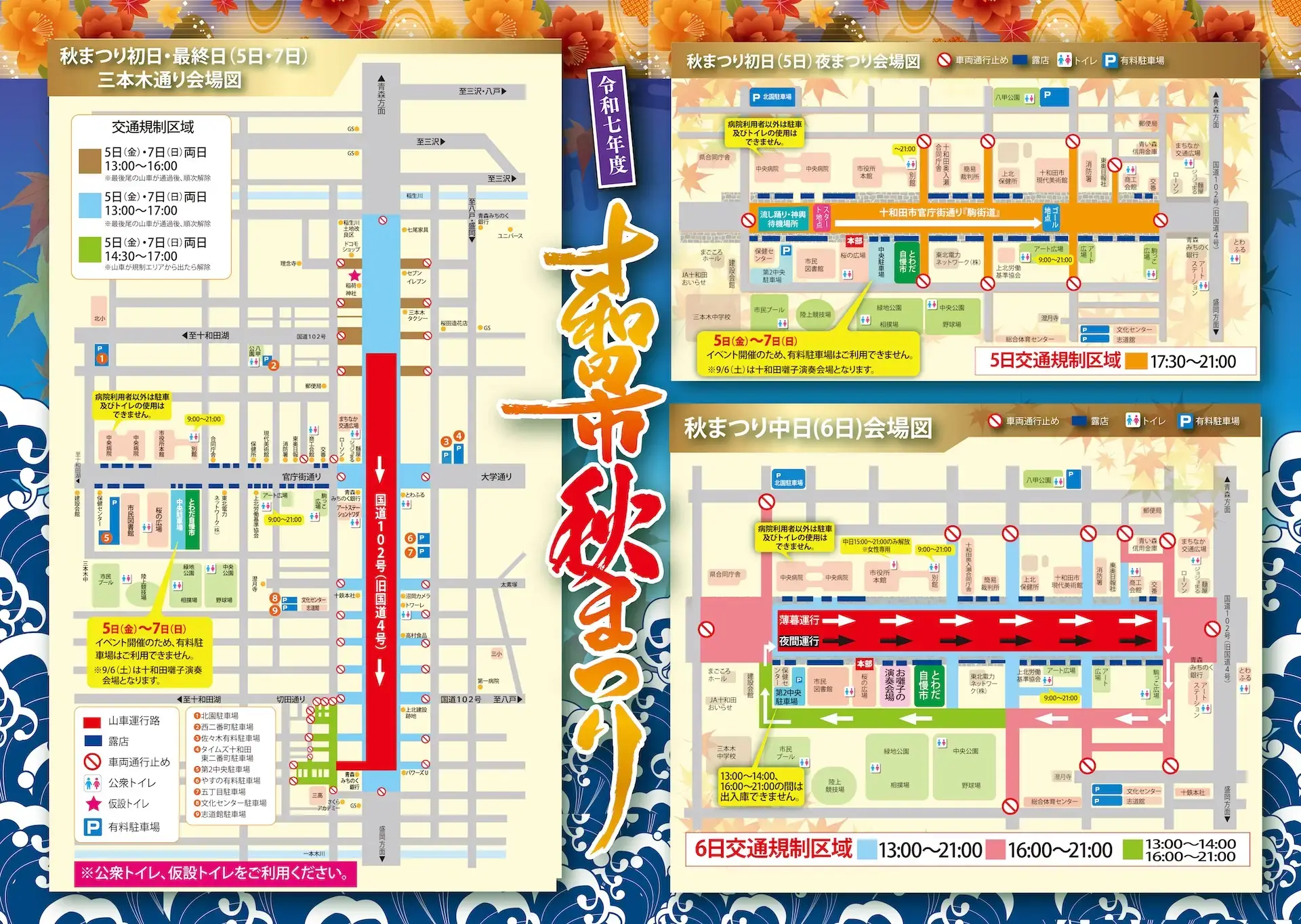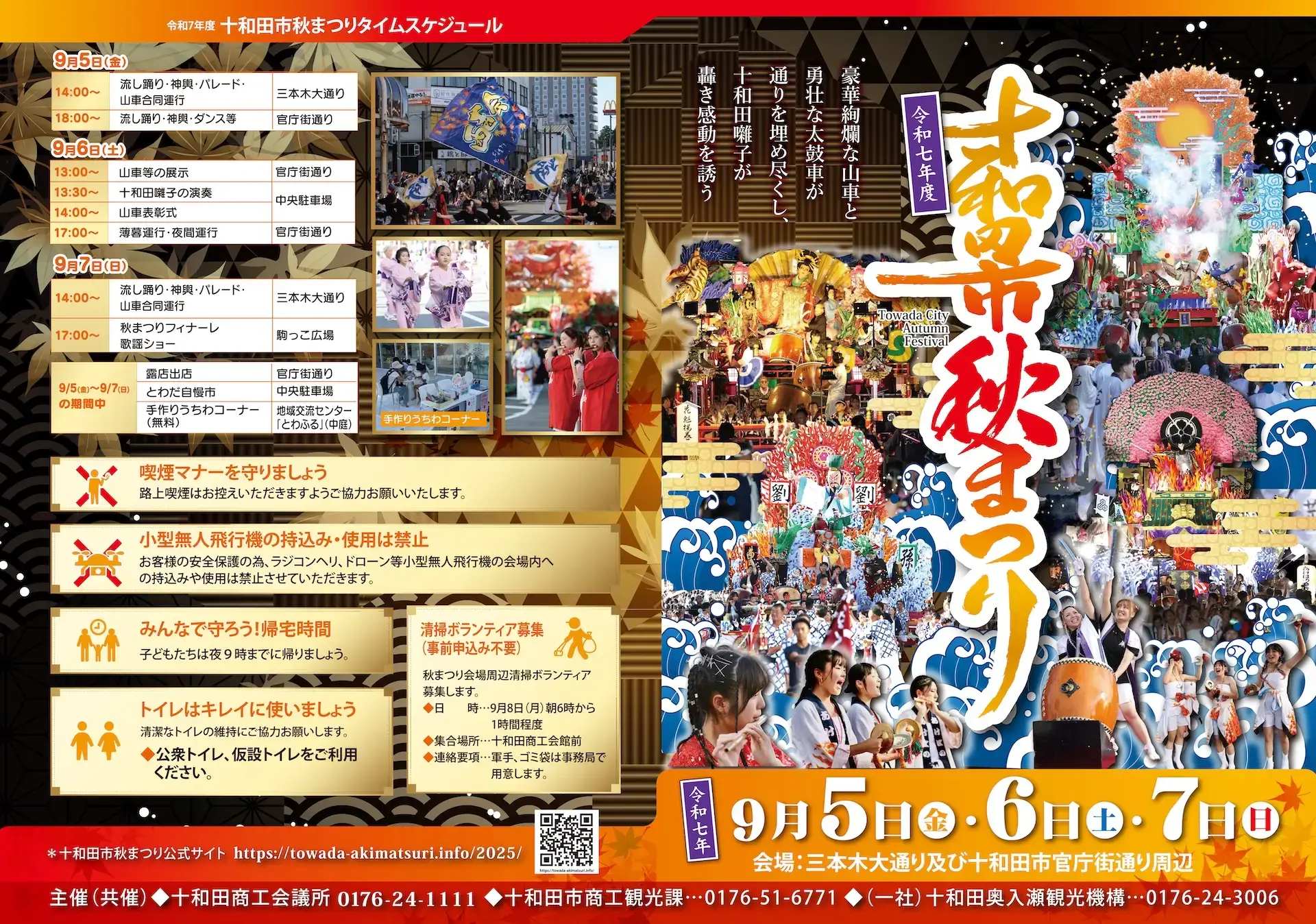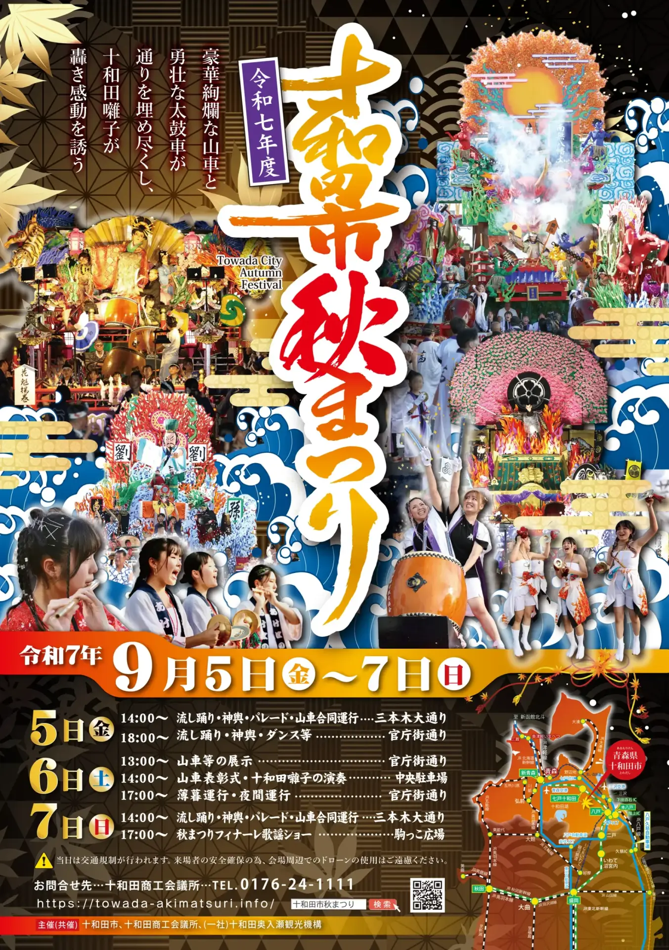 その後、運営は十和田市観光協会へと引き継がれ、1971年(昭和46年)には十和田青年会議所が主催する「お祭り広場」が中日に設けられ、さらに1974年(昭和49年)からは山車の夜間運行が加わることで、より華やかな演出が加わりました。現在では、9月第2週の金・土・日の3日間にわたって行われ、街を挙げた一大イベントとして親しまれています。