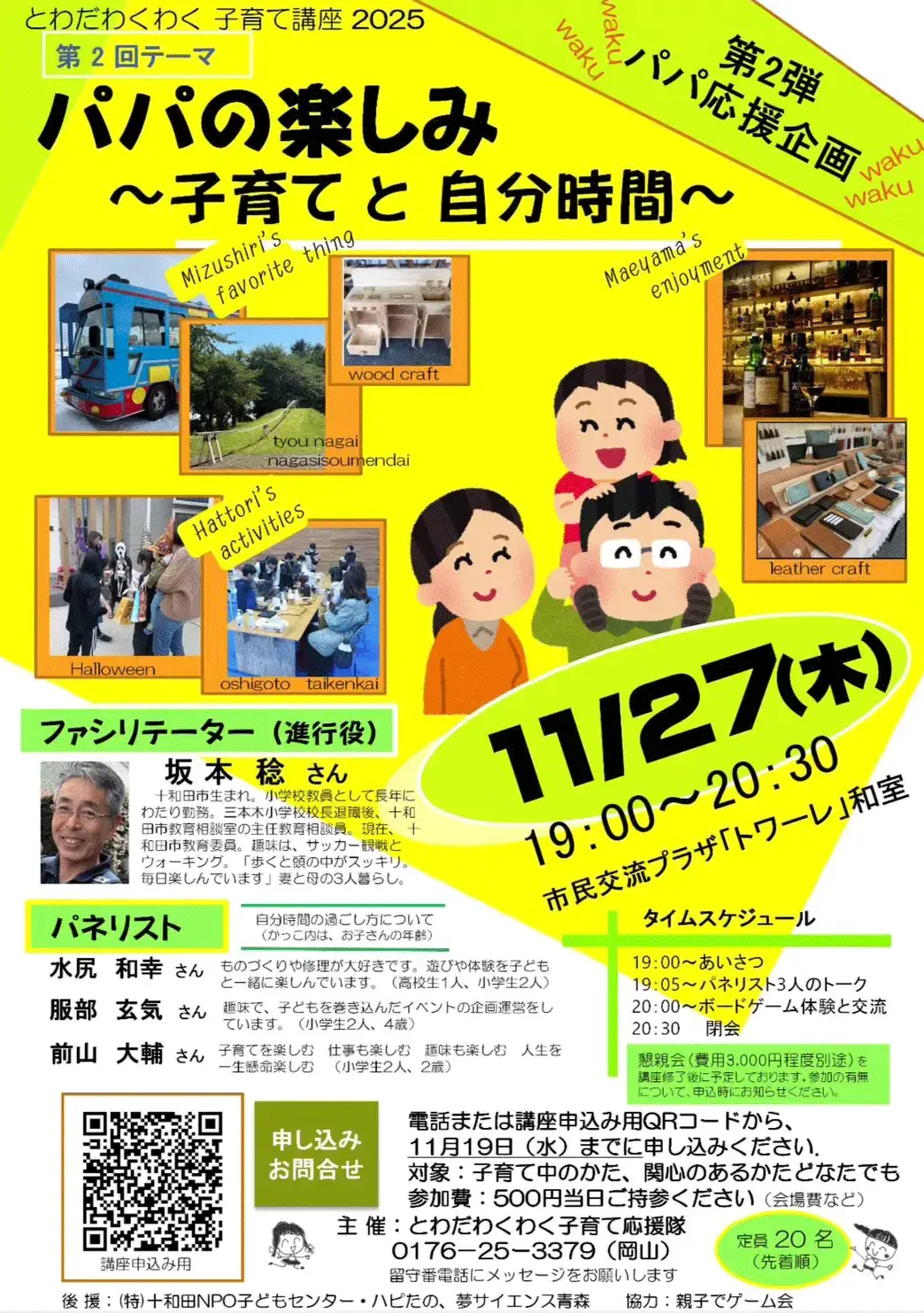 青森県十和田市では、2025年11月27日(木)に、市民交流プラザ「トワーレ」和室で「とわだわくわく子育て講座 パパの楽しみ〜子育てと自分時間〜」が開催されます。本講座は、市内で公私ともに活躍する3名のパパが登壇し、子育てと自分の趣味、家庭との両立、そして自分時間のつくり方について、実体験を交えて語る交流型の子育てイベントです。参加者同士の意見交換や学びの時間も設けられ、子育て中の方やこれから子育てを始める方に役立つ内容となっています。