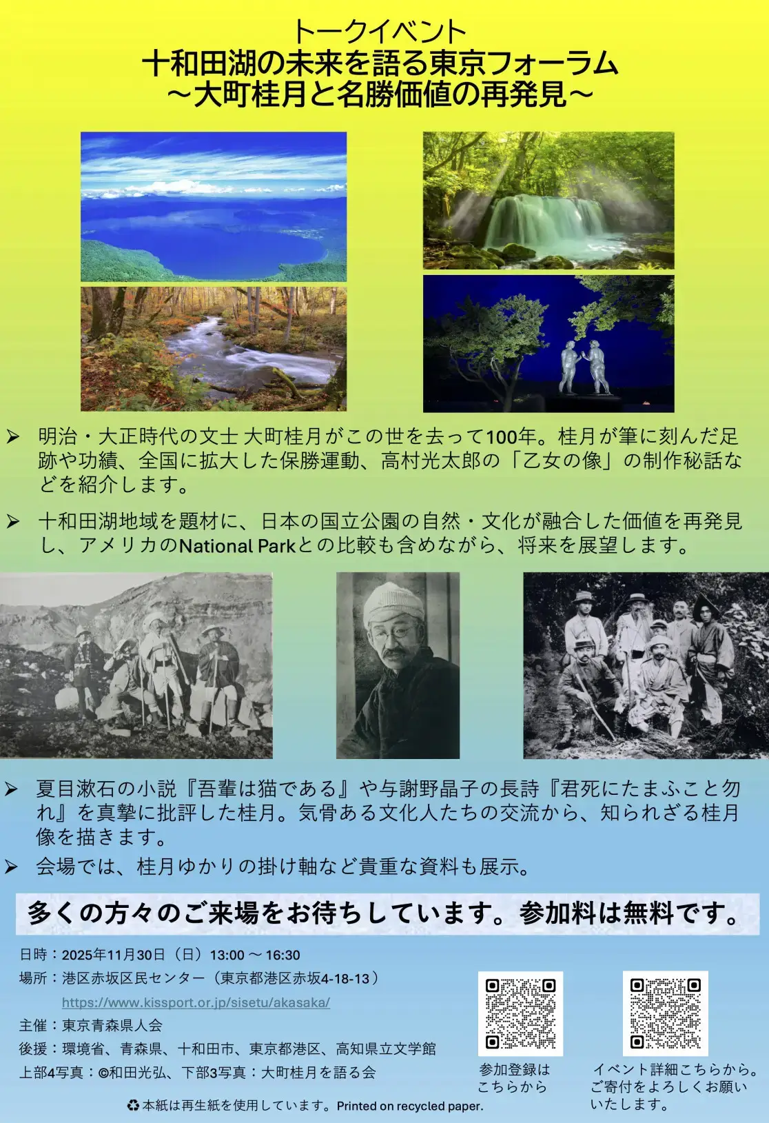 明治・大正期に活躍した文人・大町桂月(1869〜1925)の没後100年を記念し、十和田湖・奥入瀬渓流の自然と文化の価値を再発見しながら、国立公園としての未来を展望するトークイベントです。