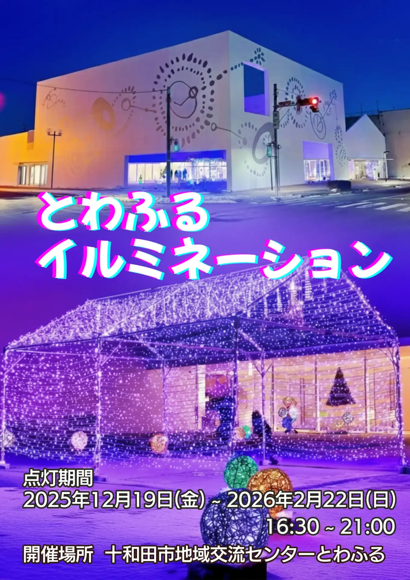 青森県十和田市の地域交流センターとわふるで開催される「とわふるイルミネーション」は、とわふる中庭を会場に2025年12月19日(金)から2026年2月22日(日)までの期間、16:30〜21:00の時間帯で点灯し、青色LEDを中心とした幻想的なライトアップが冬の夜を彩るイベントです。
