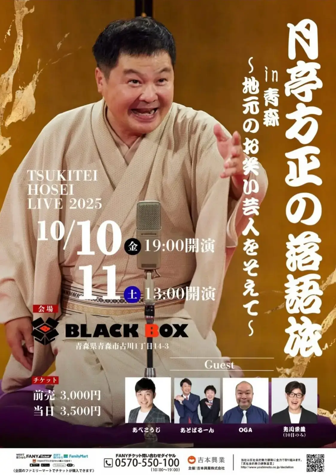 青森県青森市のライブハウス「BLACK BOX」を会場に、「月亭方正の落語旅 in 青森 〜地元のお笑い芸人をそえて〜」が開催されます。公演は2025年10月10日(金)19:00開演と、10月11日(土)13:00開演の2日間。出演は、月亭方正をはじめ、あべこうじ、あどばるーん、OGA、さらに10日限定で先川栄蔵も登場します。全国で人気の落語と地元芸人による賑やかなステージを楽しめる特別な公演です。