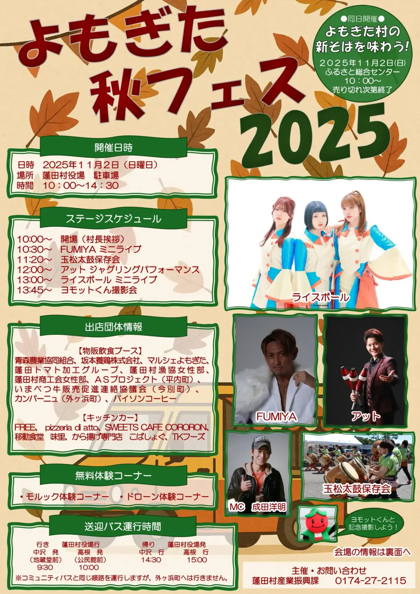 青森県蓬田村の秋の恒例イベント「よもぎた秋フェス2025」が、2025年11月2日(日)に蓬田村役場 駐車場で開催されます。